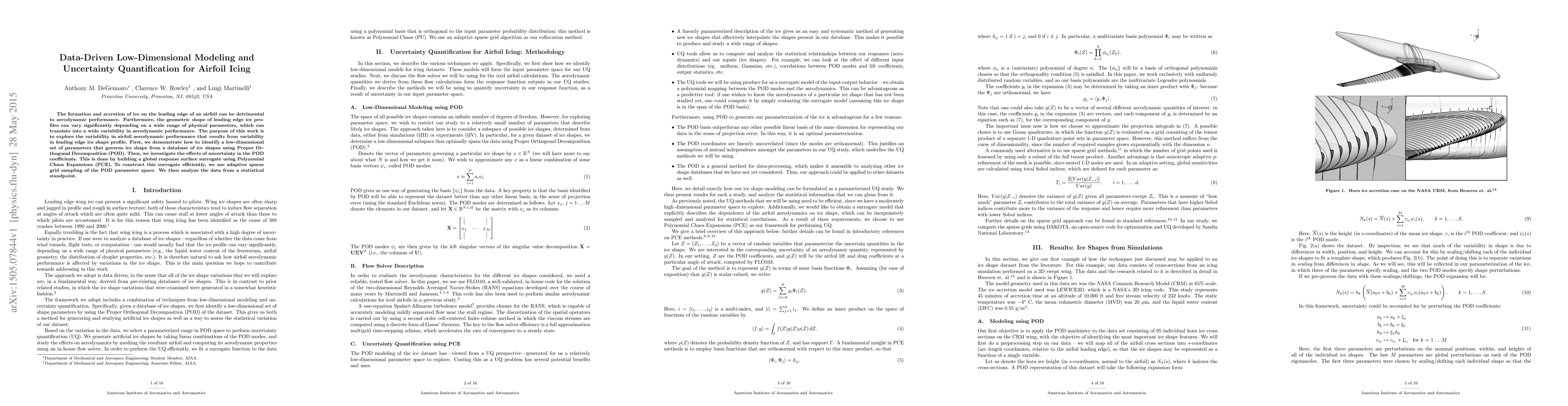 This paper develops a low-dimensional model for airfoil icing using Proper Orthogonal Decomposition (POD) to identify key parameters governing ice shape. It quantifies uncertainty in aerodynamic performance due to ice shape variability using Polynomial Chaos Expansions (PCE) and adaptive sparse grid sampling, followed by statistical analysis.