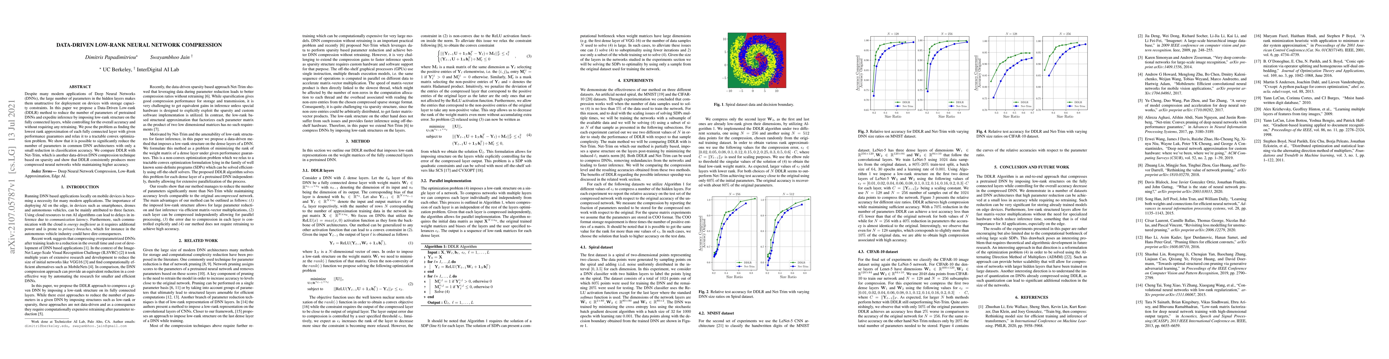 This paper proposes a Data-Driven Low-Rank (DDLR) method to compress Deep Neural Networks (DNNs) by imposing low-rank structures on fully connected layers, significantly reducing parameters without retraining and with minimal loss in accuracy. DDLR outperforms Net-Trim in producing more compressed networks while maintaining higher accuracy.