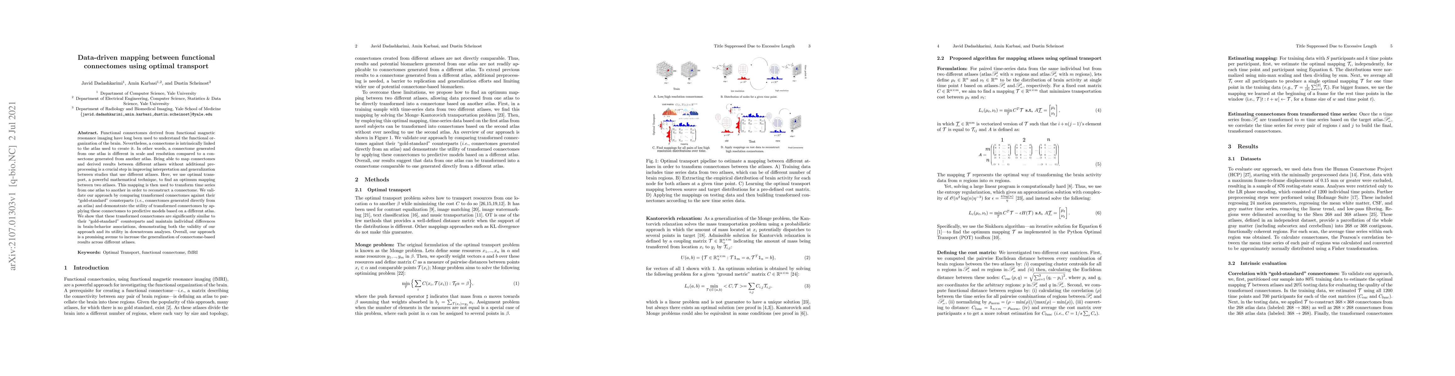 Functional connectomes derived from functional magnetic resonance imaging have long been used to understand the functional organization of the brain. Nevertheless, a connectome is intrinsically linked to the atlas used to create it. In other words, a connectome generated from one atlas is different in scale and resolution compared to a connectome generated from another atlas. Being able to map connectomes and derived results between different atlases without additional pre-processing is a crucial step in improving interpretation and generalization between studies that use different atlases. Here, we use optimal transport, a powerful mathematical technique, to find an optimum mapping between two atlases. This mapping is then used to transform time series from one atlas to another in order to reconstruct a connectome. We validate our approach by comparing transformed connectomes against their "gold-standard" counterparts (i.e., connectomes generated directly from an atlas) and demonstrate the utility of transformed connectomes by applying these connectomes to predictive models based on a different atlas. We show that these transformed connectomes are significantly similar to their "gold-standard" counterparts and maintain individual differences in brain-behavior associations, demonstrating both the validity of our approach and its utility in downstream analyses. Overall, our approach is a promising avenue to increase the generalization of connectome-based results across different atlases.
