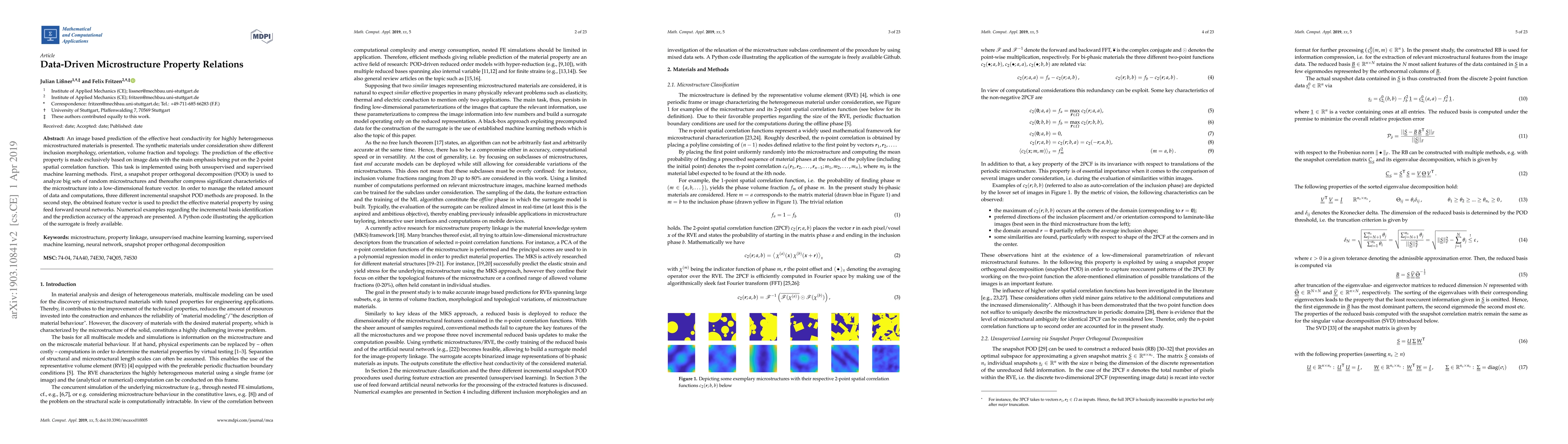 This paper presents a machine learning-based prediction of effective heat conductivity in heterogeneous microstructured materials using image data. It employs unsupervised and supervised methods, including snapshot proper orthogonal decomposition (POD) and feedforward neural networks, to analyze and compress microstructure features for accurate property prediction.
