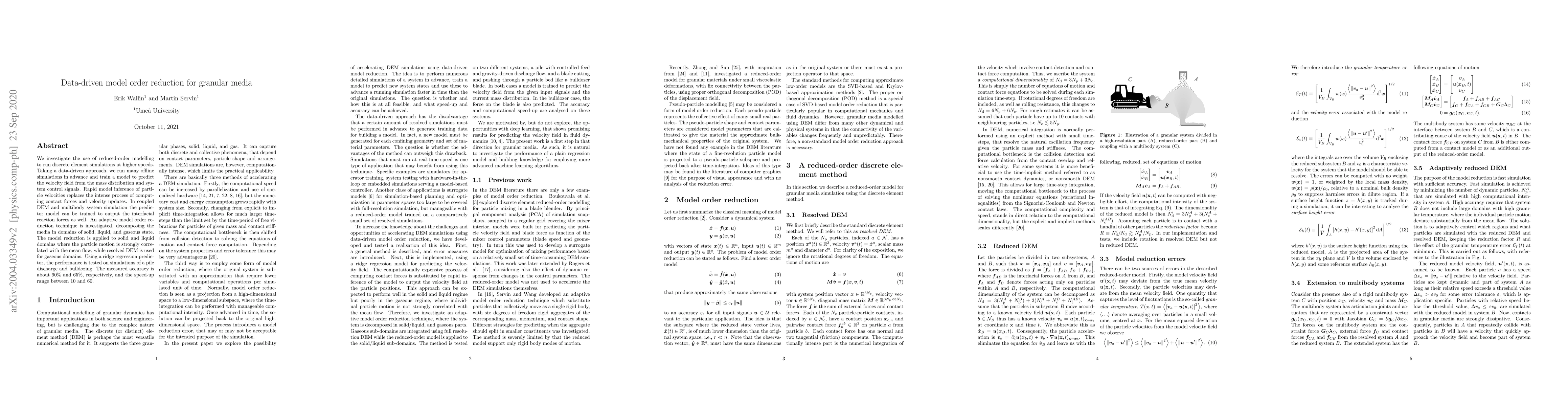 This paper proposes a data-driven model order reduction technique to accelerate discrete element simulations of granular media by predicting particle velocities and interfacial forces, achieving a speed-up of 10 to 60 times with about 90% accuracy in pile discharge simulations and 65% in bulldozing simulations.