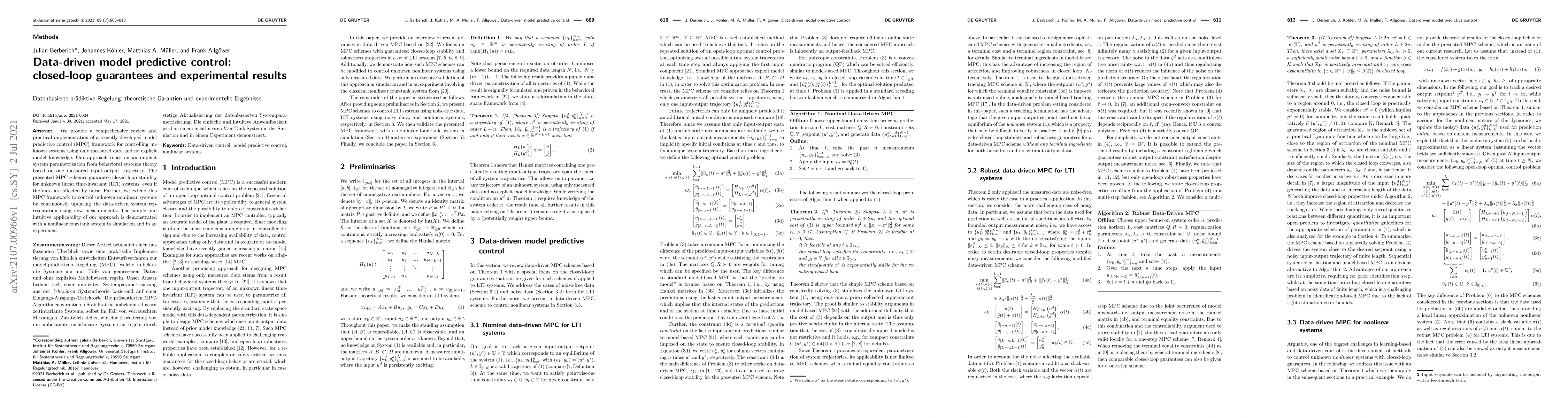 We provide a comprehensive review and practical implementation of a recently developed model predictive control (MPC) framework for controlling unknown systems using only measured data and no explicit model knowledge. Our approach relies on an implicit system parametrization from behavioral systems theory based on one measured input-output trajectory. The presented MPC schemes guarantee closed-loop stability for unknown linear time-invariant (LTI) systems, even if the data are affected by noise. Further, we extend this MPC framework to control unknown nonlinear systems by continuously updating the data-driven system representation using new measurements. The simple and intuitive applicability of our approach is demonstrated with a nonlinear four-tank system in simulation and in an experiment.