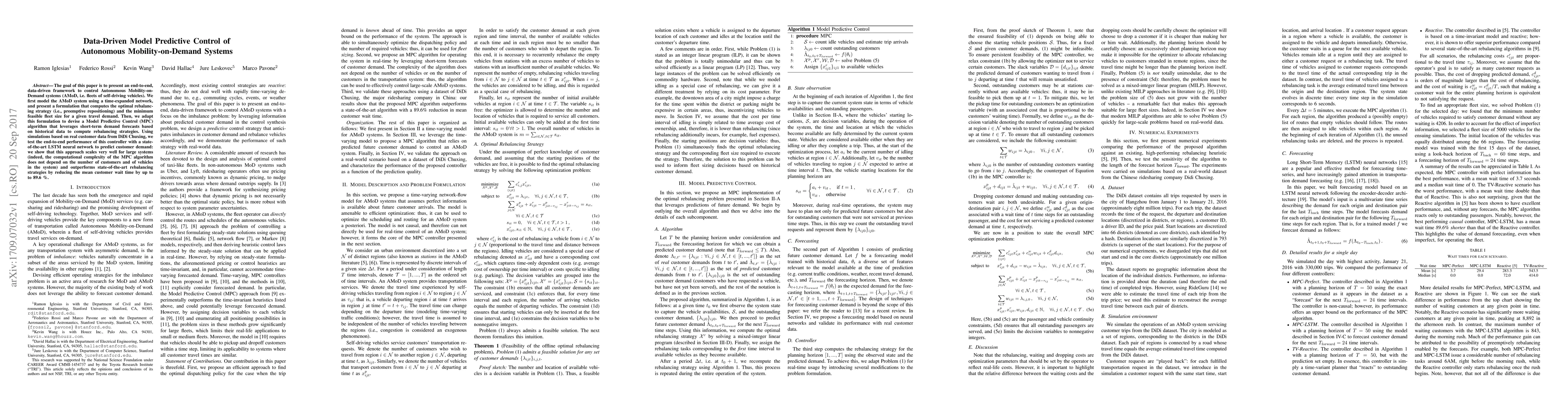 The goal of this paper is to present an end-to-end, data-driven framework to control Autonomous Mobility-on-Demand systems (AMoD, i.e. fleets of self-driving vehicles). We first model the AMoD system using a time-expanded network, and present a formulation that computes the optimal rebalancing strategy (i.e., preemptive repositioning) and the minimum feasible fleet size for a given travel demand. Then, we adapt this formulation to devise a Model Predictive Control (MPC) algorithm that leverages short-term demand forecasts based on historical data to compute rebalancing strategies. We test the end-to-end performance of this controller with a state-of-the-art LSTM neural network to predict customer demand and real customer data from DiDi Chuxing: we show that this approach scales very well for large systems (indeed, the computational complexity of the MPC algorithm does not depend on the number of customers and of vehicles in the system) and outperforms state-of-the-art rebalancing strategies by reducing the mean customer wait time by up to to 89.6%.