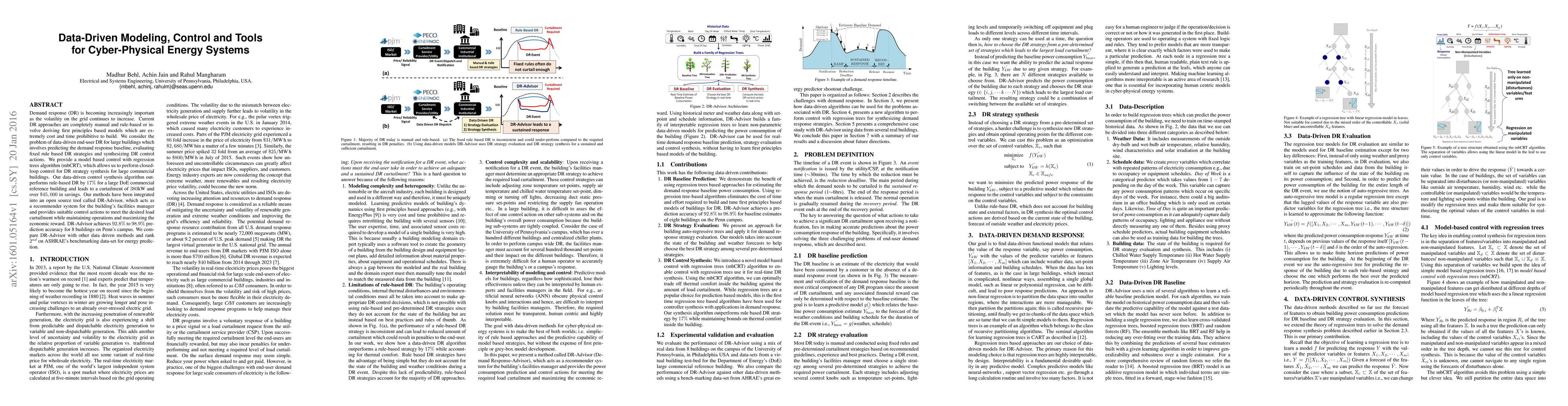 This paper presents a data-driven approach for demand response (DR) in large commercial buildings using regression trees for control synthesis, outperforming traditional rule-based methods by 17%. The proposed mbCRT algorithm and DR-Advisor tool achieve significant savings and high prediction accuracy.