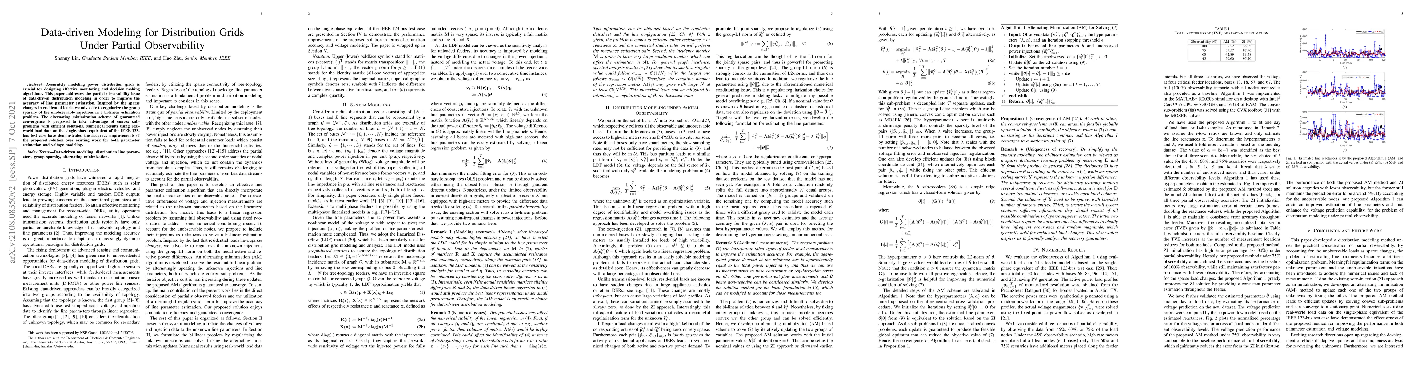 Accurately modeling power distribution grids is crucial for designing effective monitoring and decision making algorithms. This paper addresses the partial observability issue of data-driven distribution modeling in order to improve the accuracy of line parameter estimation. Inspired by the sparse changes in residential loads, we advocate to regularize the group sparsity of the unobservable injections in a bi-linear estimation problem. The alternating minimization scheme of guaranteed convergence is proposed to take advantage of convex subproblems with efficient solutions. Numerical results using real-world load data on the single-phase equivalent of the IEEE 123-bus test case have demonstrated the accuracy improvements of the proposed solution over existing work for both parameter estimation and voltage modeling.
