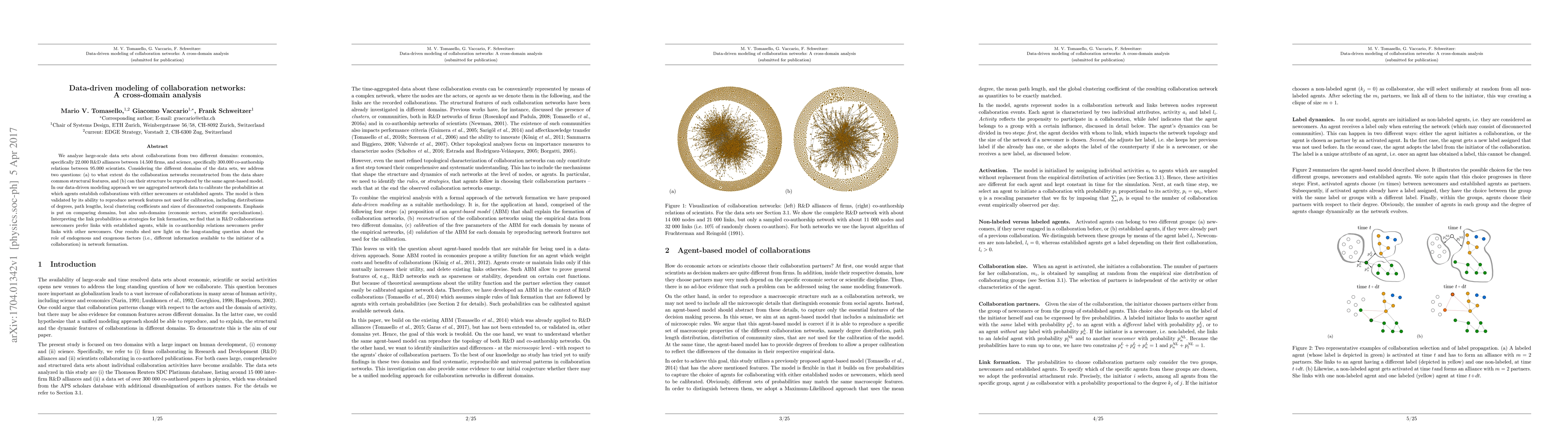 We analyze large-scale data sets about collaborations from two different domains: economics, specifically 22.000 R&D alliances between 14.500 firms, and science, specifically 300.000 co-authorship relations between 95.000 scientists. Considering the different domains of the data sets, we address two questions: (a) to what extent do the collaboration networks reconstructed from the data share common structural features, and (b) can their structure be reproduced by the same agent-based model. In our data-driven modeling approach we use aggregated network data to calibrate the probabilities at which agents establish collaborations with either newcomers or established agents. The model is then validated by its ability to reproduce network features not used for calibration, including distributions of degrees, path lengths, local clustering coefficients and sizes of disconnected components. Emphasis is put on comparing domains, but also sub-domains (economic sectors, scientific specializations). Interpreting the link probabilities as strategies for link formation, we find that in R&D collaborations newcomers prefer links with established agents, while in co-authorship relations newcomers prefer links with other newcomers. Our results shed new light on the long-standing question about the role of endogenous and exogenous factors (i.e., different information available to the initiator of a collaboration) in network formation.