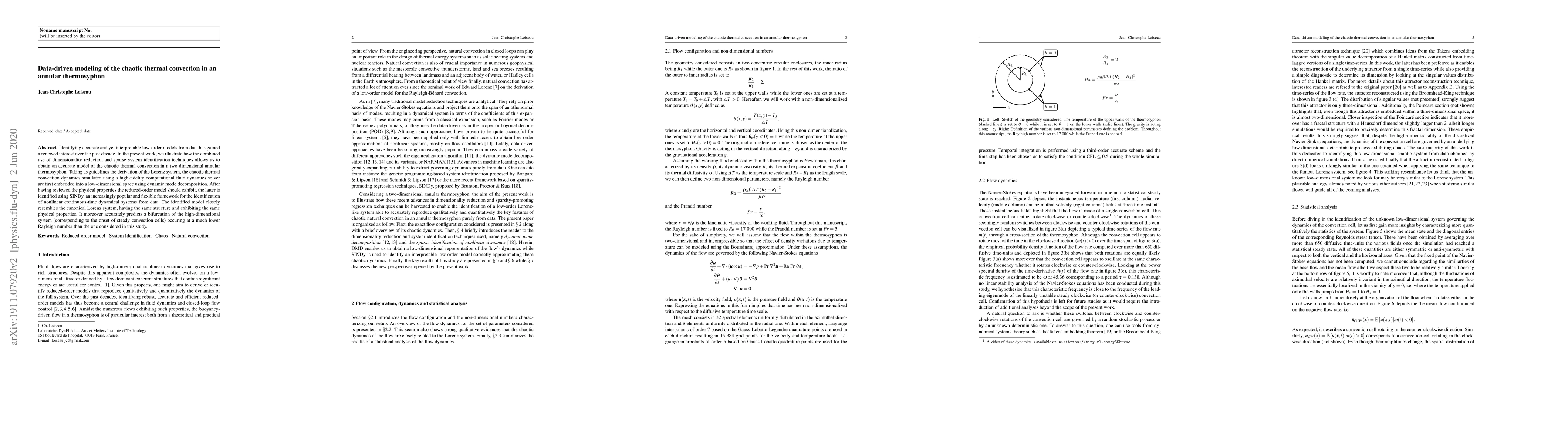 dentifying accurate and yet interpretable low-order models from data has gained a renewed interest over the past decade. In the present work, we illustrate how the combined use of dimensionality reduction and sparse system identification techniques allows us to obtain an accurate model of the chaotic thermal convection in a two-dimensional annular thermosyphon. Taking as guidelines the derivation of the Lorenz system, the chaotic thermal convection dynamics simulated using a high-fidelity computational fluid dynamics solver are first embedded into a low-dimensional space using dynamic mode decomposition. After having reviewed the physical properties the reduced-order model should exhibit, the latter is identified using SINDy, an increasingly popular and flexible framework for the identification of nonlinear continuous-time dynamical systems from data. The identified model closely resembles the canonical Lorenz system, having a similar structure and exhibiting the same physical properties. Finally, extensions to other flow configurations with or without control are discussed.