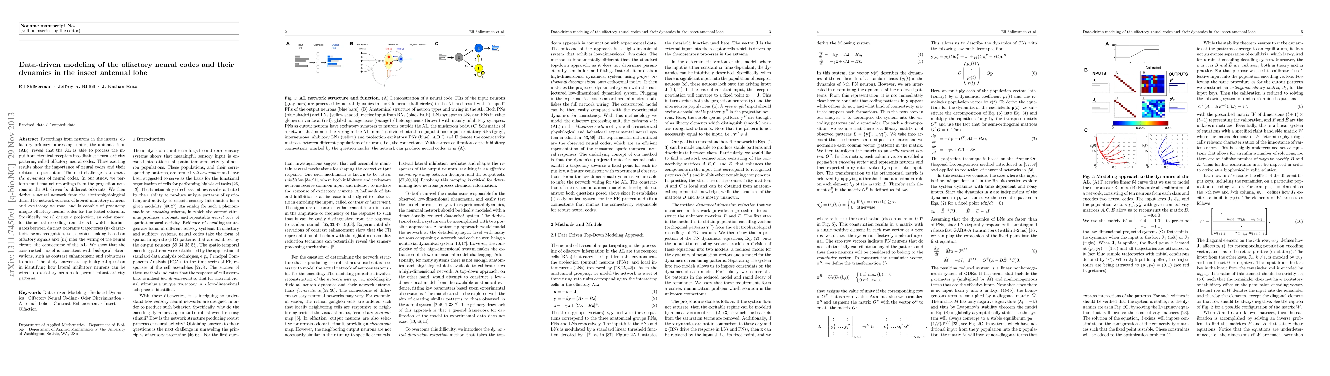 Recordings from neurons in the insects' olfactory primary processing center, the antennal lobe (AL), reveal that the AL is able to process the input from chemical receptors into distinct neural activity patterns, called olfactory neural codes. These exciting results show the importance of neural codes and their relation to perception. The next challenge is to \emph{model the dynamics} of neural codes. In our study, we perform multichannel recordings from the projection neurons in the AL driven by different odorants. We then derive a neural network from the electrophysiological data. The network consists of lateral-inhibitory neurons and excitatory neurons, and is capable of producing unique olfactory neural codes for the tested odorants. Specifically, we (i) design a projection, an odor space, for the neural recording from the AL, which discriminates between distinct odorants trajectories (ii) characterize scent recognition, i.e., decision-making based on olfactory signals and (iii) infer the wiring of the neural circuit, the connectome of the AL. We show that the constructed model is consistent with biological observations, such as contrast enhancement and robustness to noise. The study answers a key biological question in identifying how lateral inhibitory neurons can be wired to excitatory neurons to permit robust activity patterns.