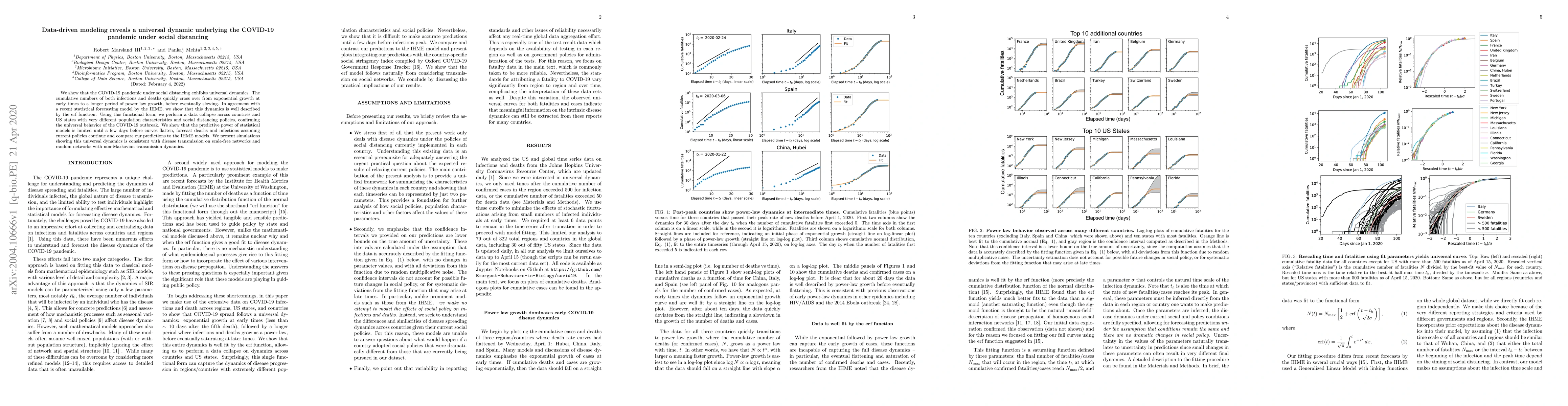 We show that the COVID-19 pandemic under social distancing exhibits universal dynamics. The cumulative numbers of both infections and deaths quickly cross over from exponential growth at early times to a longer period of power law growth, before eventually slowing. In agreement with a recent statistical forecasting model by the IHME, we show that this dynamics is well described by the erf function. Using this functional form, we perform a data collapse across countries and US states with very different population characteristics and social distancing policies, confirming the universal behavior of the COVID-19 outbreak. We show that the predictive power of statistical models is limited until a few days before curves flatten, forecast deaths and infections assuming current policies continue and compare our predictions to the IHME models. We present simulations showing this universal dynamics is consistent with disease transmission on scale-free networks and random networks with non-Markovian transmission dynamics.