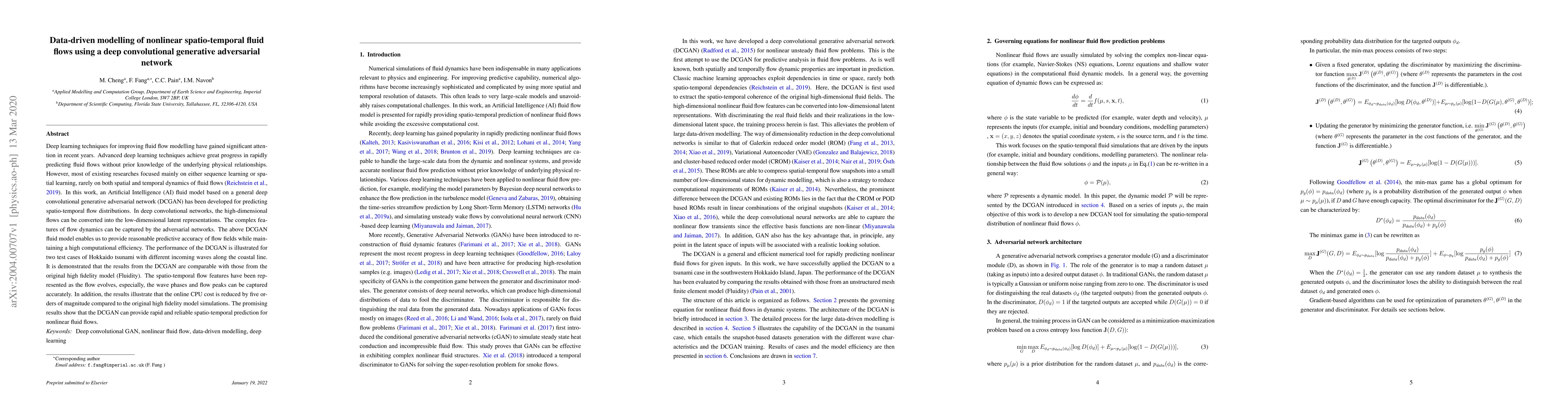 This paper develops a deep convolutional generative adversarial network (DCGAN) for predicting nonlinear spatio-temporal fluid flows, achieving high predictive accuracy and computational efficiency compared to traditional high fidelity models. The model demonstrates significant reductions in online CPU cost while maintaining comparable accuracy for tsunami simulations.