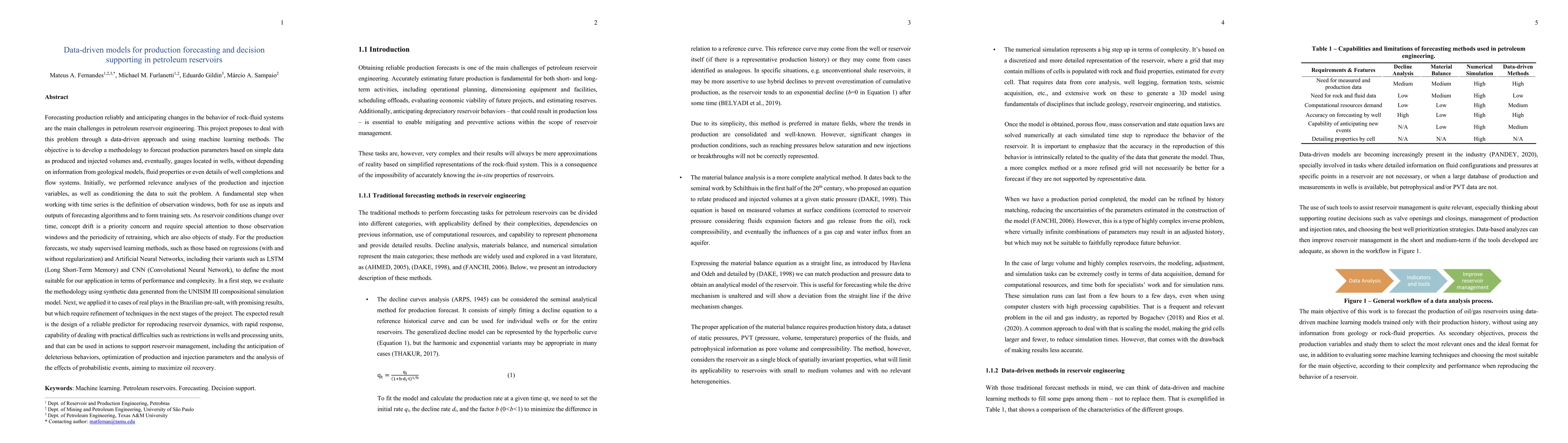Forecasting production reliably and anticipating changes in the behavior of rock-fluid systems are the main challenges in petroleum reservoir engineering. This project proposes to deal with this problem through a data-driven approach and using machine learning methods. The objective is to develop a methodology to forecast production parameters based on simple data as produced and injected volumes and, eventually, gauges located in wells, without depending on information from geological models, fluid properties or details of well completions and flow systems. Initially, we performed relevance analyses of the production and injection variables, as well as conditioning the data to suit the problem. As reservoir conditions change over time, concept drift is a priority concern and require special attention to those observation windows and the periodicity of retraining, which are also objects of study. For the production forecasts, we study supervised learning methods, such as those based on regressions and Neural Networks, to define the most suitable for our application in terms of performance and complexity. In a first step, we evaluate the methodology using synthetic data generated from the UNISIM III compositional simulation model. Next, we applied it to cases of real plays in the Brazilian pre-salt. The expected result is the design of a reliable predictor for reproducing reservoir dynamics, with rapid response, capability of dealing with practical difficulties such as restrictions in wells and processing units, and that can be used in actions to support reservoir management, including the anticipation of deleterious behaviors, optimization of production and injection parameters and the analysis of the effects of probabilistic events, aiming to maximize oil recovery.
