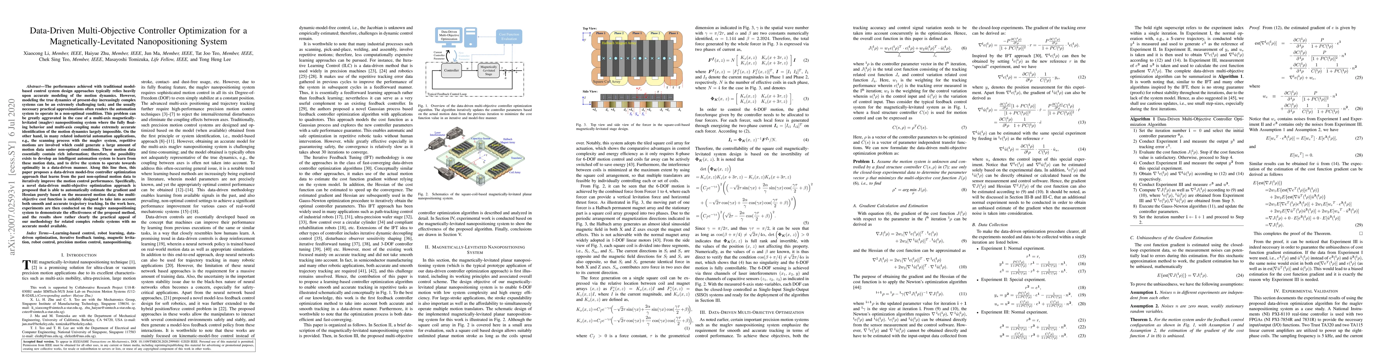 This paper proposes a data-driven multi-objective optimization approach to improve the control performance of a magnetically-levitated nanopositioning system, leveraging historical non-optimal motion data to iteratively refine the controller. The method estimates gradient and Hessian from measured data, optimizing for both smooth and accurate trajectory tracking.