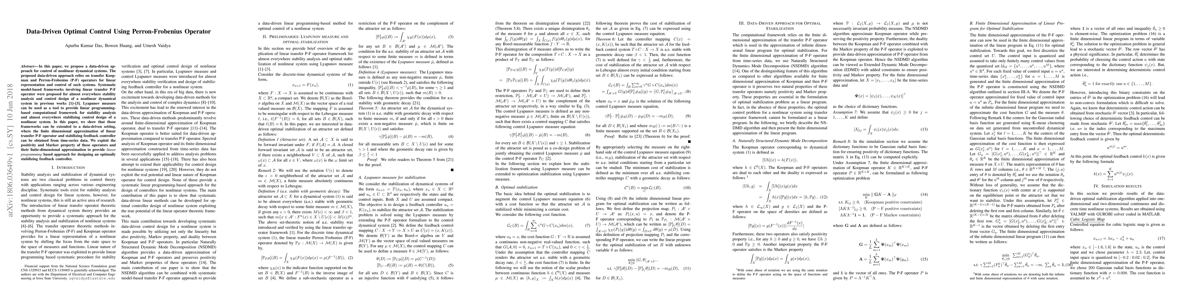 This paper proposes a data-driven method for controlling nonlinear dynamical systems using transfer Koopman and Perron-Frobenius operators, enabling linear representation and control. It extends previous model-based frameworks to a data-driven setting, utilizing finite-dimensional approximations from time-series data to design optimally stabilizing feedback controllers via linear programming.