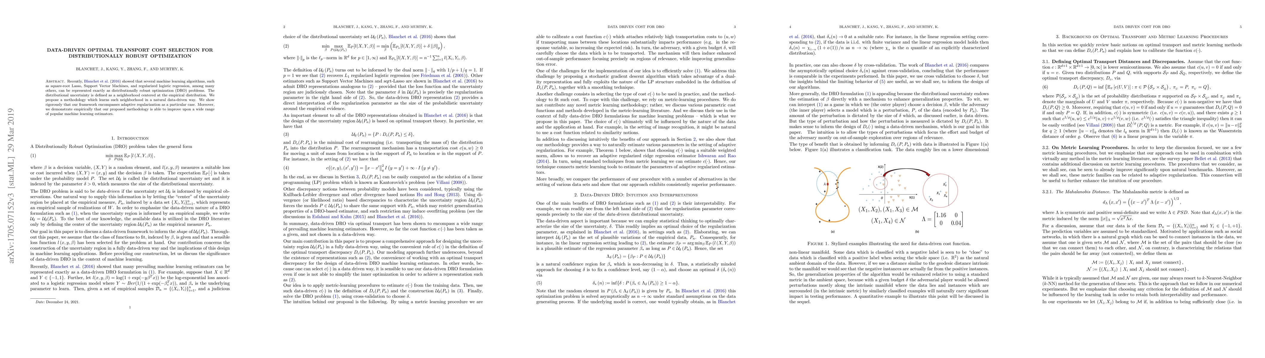 Recently, (Blanchet, Kang, and Murhy 2016, and Blanchet, and Kang 2017) showed that several machine learning algorithms, such as square-root Lasso, Support Vector Machines, and regularized logistic regression, among many others, can be represented exactly as distributionally robust optimization (DRO) problems. The distributional uncertainty is defined as a neighborhood centered at the empirical distribution. We propose a methodology which learns such neighborhood in a natural data-driven way. We show rigorously that our framework encompasses adaptive regularization as a particular case. Moreover, we demonstrate empirically that our proposed methodology is able to improve upon a wide range of popular machine learning estimators.