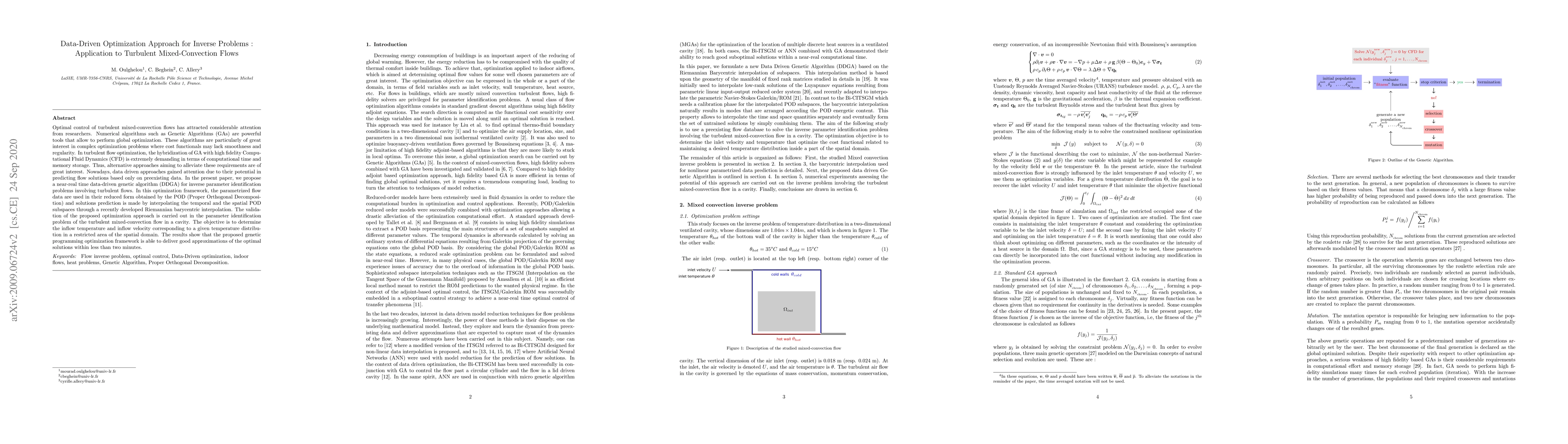 Optimal control of turbulent mixed-convection flows has attracted considerable attention from researchers. Numerical algorithms such as Genetic Algorithms (GAs) are powerful tools that allow to perform global optimization. These algorithms are particularly of great interest in complex optimization problems where cost functionals may lack smoothness and regularity. In turbulent flow optimization, the hybridization of GA with high fidelity Computational Fluid Dynamics (CFD) is extremely demanding in terms of computational time and memory storage. Thus, alternative approaches aiming to alleviate these requirements are of great interest. Nowadays, data driven approaches gained attention due to their potential in predicting flow solutions based only on preexisting data. In the present paper, we propose a near-real time data-driven genetic algorithm (DDGA) for inverse parameter identification problems involving turbulent flows. In this optimization framework, the parametrized flow data are used in their reduced form obtained by the POD (Proper Orthogonal Decomposition) and solutions prediction is made by interpolating the temporal and the spatial POD subspaces through a recently developed Riemannian barycentric interpolation. The validation of the proposed optimization approach is carried out in the parameter identification problem of the turbulent mixed-convection flow in a cavity. The objective is to determine the inflow temperature and inflow velocity corresponding to a given temperature distribution in a restricted area of the spatial domain. The results show that the proposed genetic programming optimization framework is able to deliver good approximations of the optimal solutions within less than two minutes.