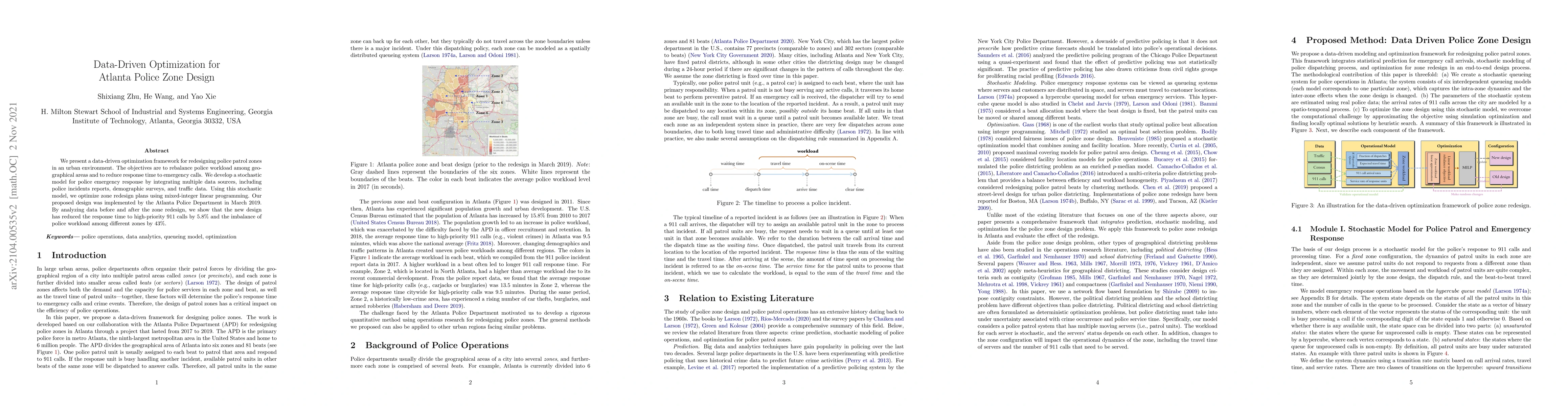 This paper proposes a data-driven optimization framework to redesign police patrol zones in Atlanta, aiming to balance workload and reduce emergency response times. The framework integrates various data sources and employs mixed-integer linear programming to optimize zone designs, resulting in a 5.8% reduction in high-priority 911 response times and a 43% reduction in workload imbalance.