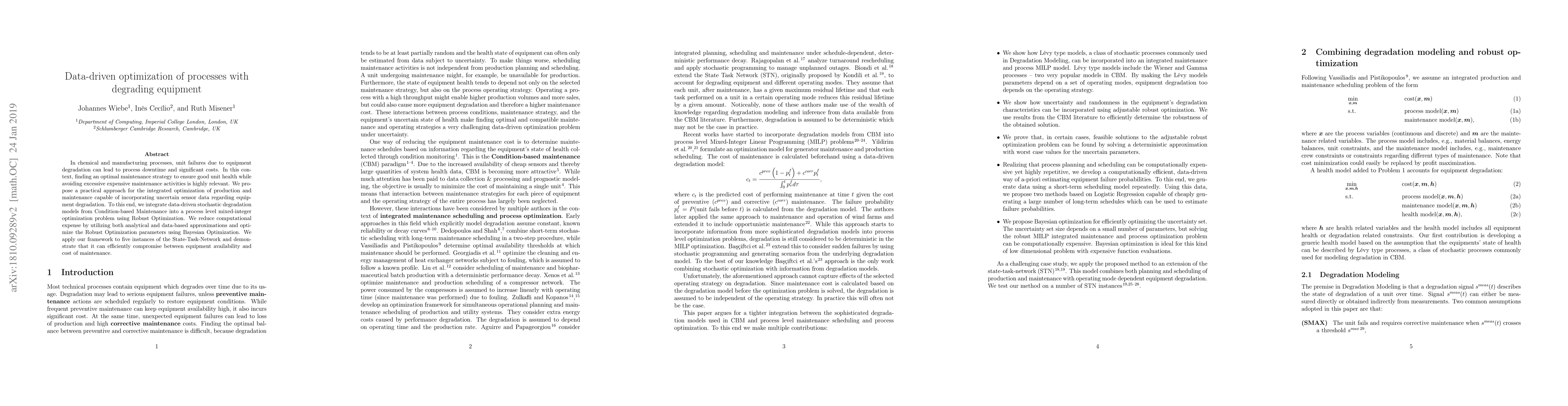 In chemical and manufacturing processes, unit failures due to equipment degradation can lead to process downtime and significant costs. In this context, finding an optimal maintenance strategy to ensure good unit health while avoiding excessive expensive maintenance activities is highly relevant. We propose a practical approach for the integrated optimization of production and maintenance capable of incorporating uncertain sensor data regarding equipment degradation. To this end, we integrate data-driven stochastic degradation models from Condition-based Maintenance into a process level mixed-integer optimization problem using Robust Optimization. We reduce computational expense by utilizing both analytical and data-based approximations and optimize the Robust optimization parameters using Bayesian Optimization. We apply our framework to five instances of the State-Task-Network and demonstrate that it can efficiently compromise between equipment availability and cost of maintenance.