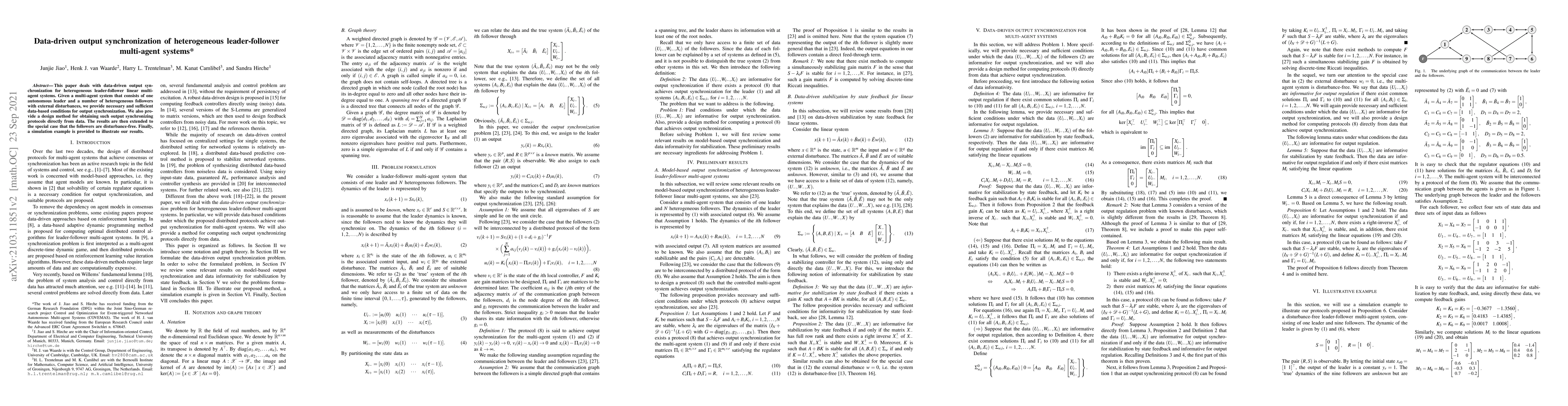 This paper presents data-driven conditions and design methods for output synchronization in heterogeneous leader-follower multi-agent systems, addressing both systems with and without external disturbances, and demonstrates the approach through a simulation example.
