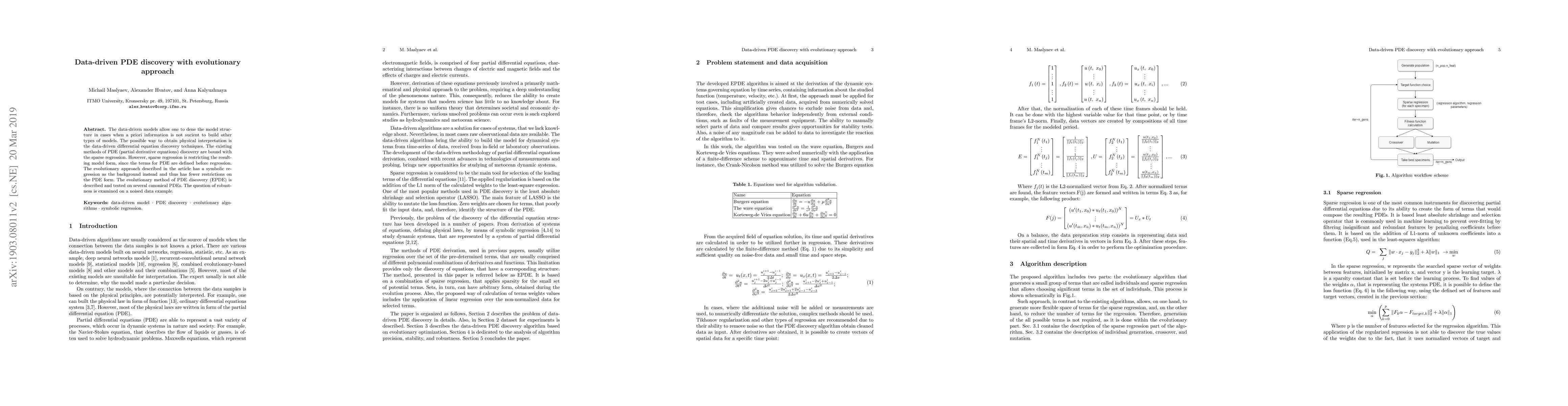 The data-driven models allow one to define the model structure in cases when a priori information is not sufficient to build other types of models. The possible way to obtain physical interpretation is the data-driven differential equation discovery techniques. The existing methods of PDE (partial derivative equations) discovery are bound with the sparse regression. However, sparse regression is restricting the resulting model form, since the terms for PDE are defined before regression. The evolutionary approach described in the article has a symbolic regression as the background instead and thus has fewer restrictions on the PDE form. The evolutionary method of PDE discovery (EPDE) is described and tested on several canonical PDEs. The question of robustness is examined on a noised data example.