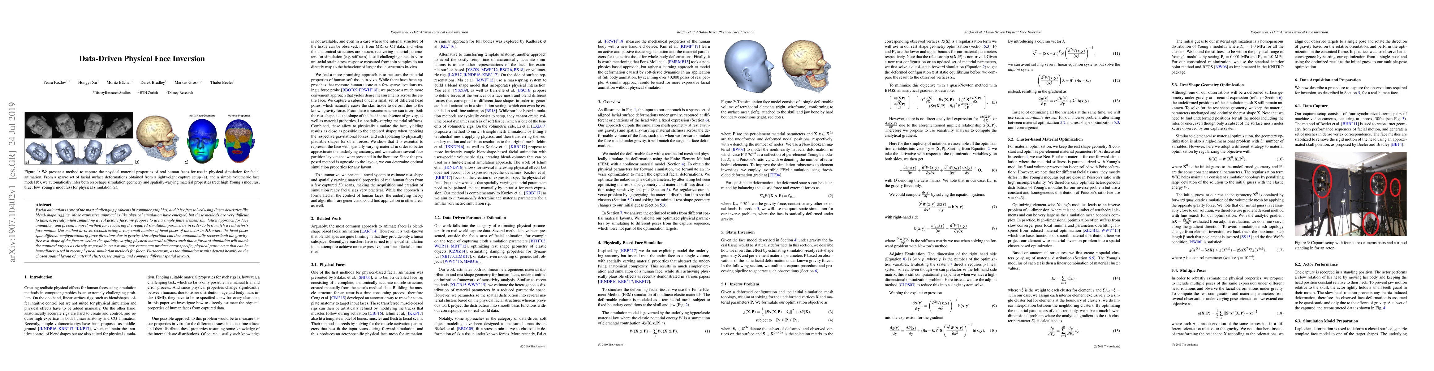 Facial animation is one of the most challenging problems in computer graphics, and it is often solved using linear heuristics like blend-shape rigging. More expressive approaches like physical simulation have emerged, but these methods are very difficult to tune, especially when simulating a real actor's face. We propose to use a simple finite element simulation approach for face animation, and present a novel method for recovering the required simulation parameters in order to best match a real actor's face motion. Our method involves reconstructing a very small number of head poses of the actor in 3D, where the head poses span different configurations of force directions due to gravity. Our algorithm can then automatically recover both the gravity-free rest shape of the face as well as the spatially-varying physical material stiffness such that a forward simulation will match the captured targets as closely as possible. As a result, our system can produce actor-specific, physical parameters that can be immediately used in recent physical simulation methods for faces. Furthermore, as the simulation results depend heavily on the chosen spatial layout of material clusters, we analyze and compare different spatial layouts.