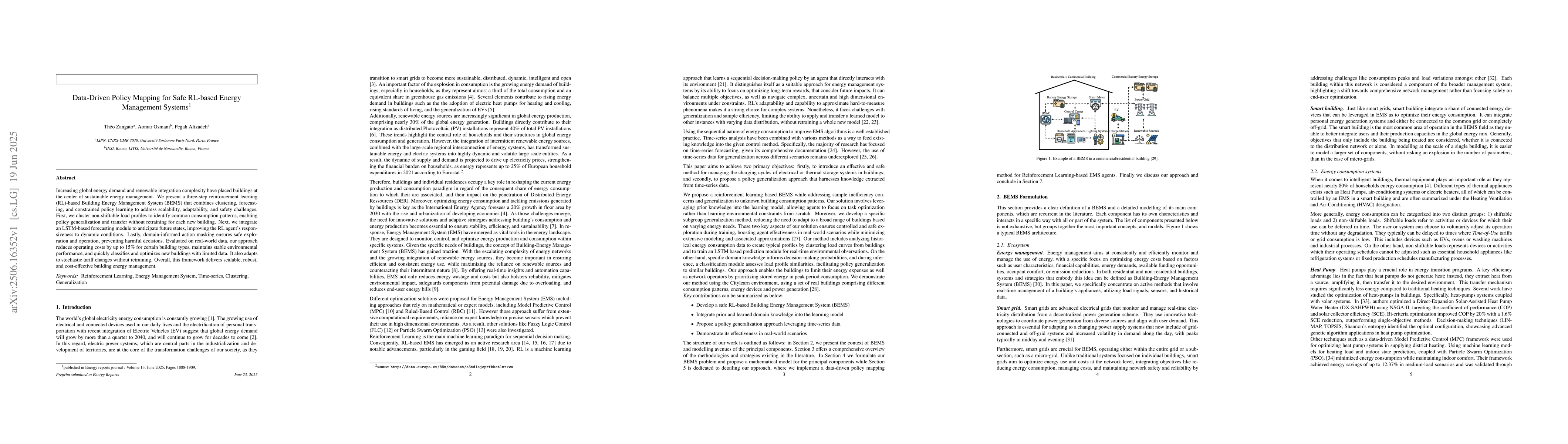 Increasing global energy demand and renewable integration complexity have placed buildings at the center of sustainable energy management. We present a three-step reinforcement learning(RL)-based Building Energy Management System (BEMS) that combines clustering, forecasting, and constrained policy learning to address scalability, adaptability, and safety challenges. First, we cluster non-shiftable load profiles to identify common consumption patterns, enabling policy generalization and transfer without retraining for each new building. Next, we integrate an LSTM based forecasting module to anticipate future states, improving the RL agents' responsiveness to dynamic conditions. Lastly, domain-informed action masking ensures safe exploration and operation, preventing harmful decisions. Evaluated on real-world data, our approach reduces operating costs by up to 15% for certain building types, maintains stable environmental performance, and quickly classifies and optimizes new buildings with limited data. It also adapts to stochastic tariff changes without retraining. Overall, this framework delivers scalable, robust, and cost-effective building energy management.