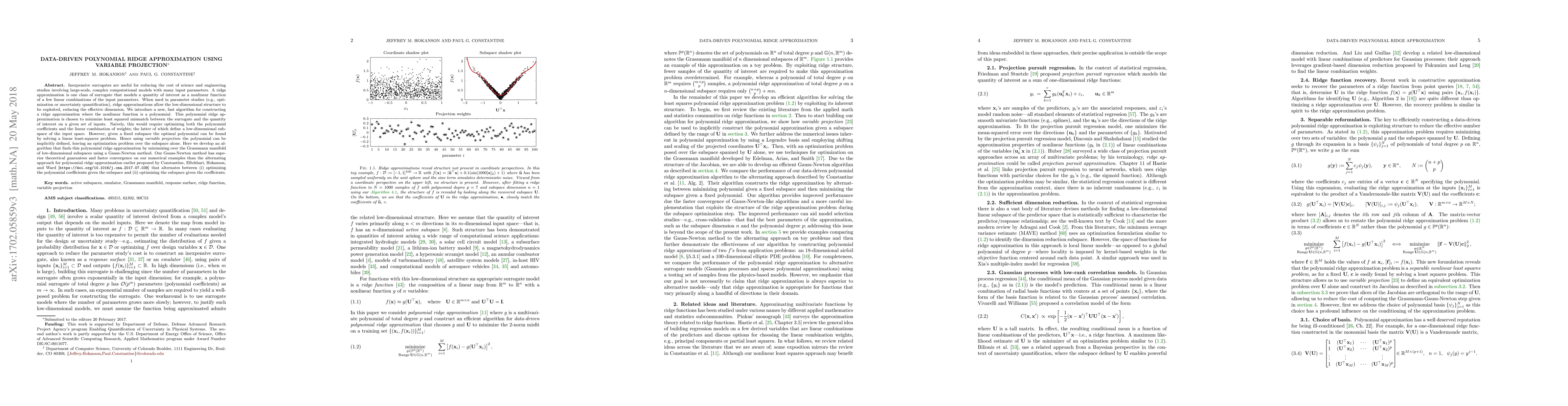 This paper introduces a fast algorithm for constructing polynomial ridge approximations to reduce computational costs in large-scale studies. It employs variable projection to optimize both polynomial coefficients and linear combination weights, achieving faster convergence and superior theoretical guarantees compared to previous alternating methods.