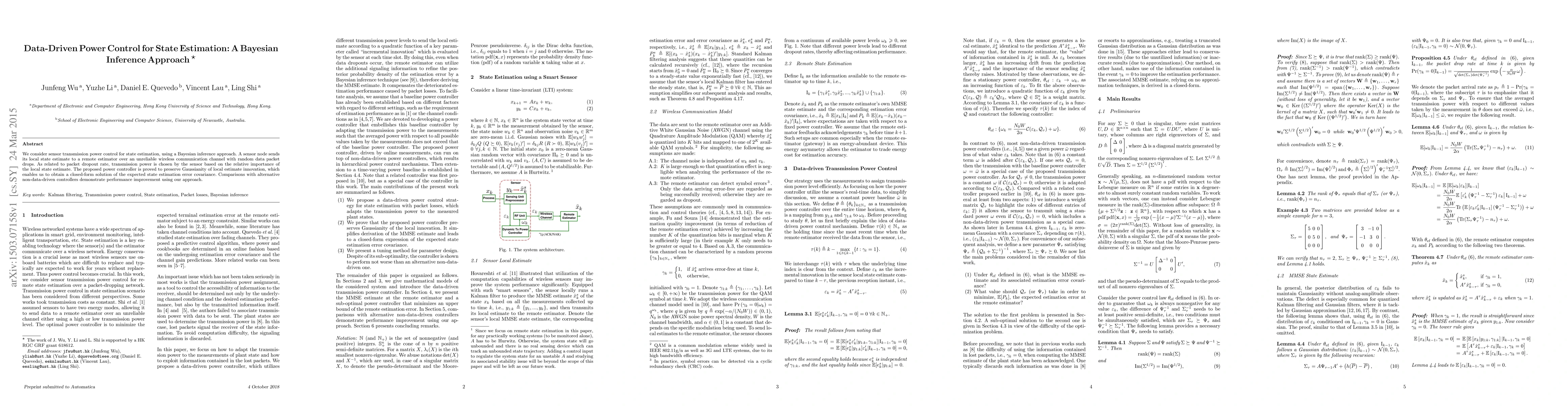 This paper proposes a Bayesian inference-based power control method for sensor nodes transmitting state estimates over unreliable wireless channels. The method adjusts transmission power based on the importance of local state estimates, preserving Gaussianity and enabling a closed-form solution for state estimation error, outperforming alternative non data-driven controllers.