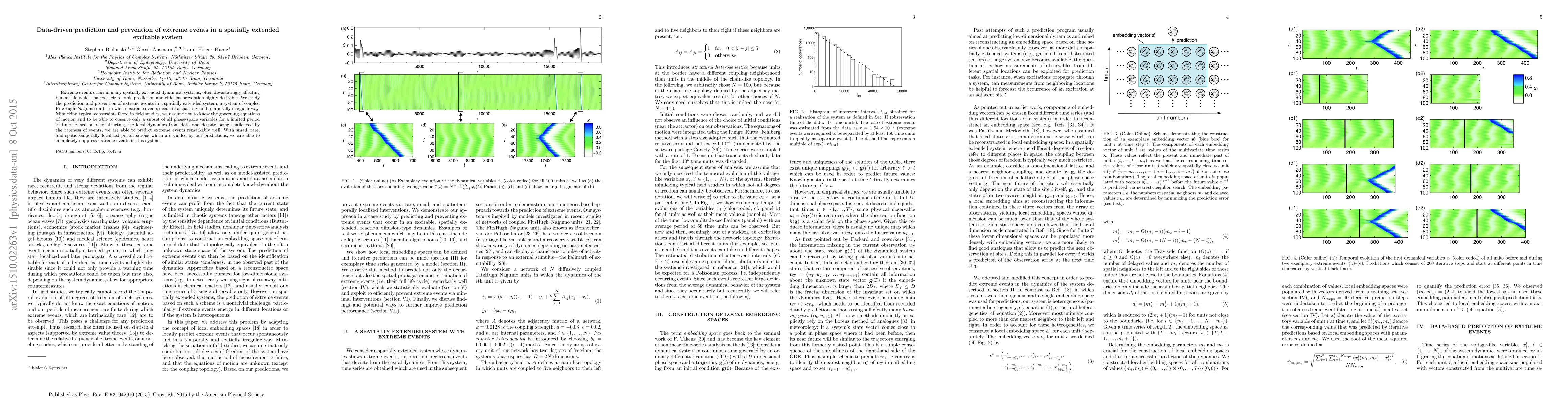 Extreme events occur in many spatially extended dynamical systems, often devastatingly affecting human life which makes their reliable prediction and efficient prevention highly desirable. We study the prediction and prevention of extreme events in a spatially extended system, a system of coupled FitzHugh-Nagumo units, in which extreme events occur in a spatially and temporally irregular way. Mimicking typical constraints faced in field studies, we assume not to know the governing equations of motion and to be able to observe only a subset of all phase-space variables for a limited period of time. Based on reconstructing the local dynamics from data and despite being challenged by the rareness of events, we are able to predict extreme events remarkably well. With small, rare, and spatiotemporally localized perturbations which are guided by our predictions, we are able to completely suppress extreme events in this system.