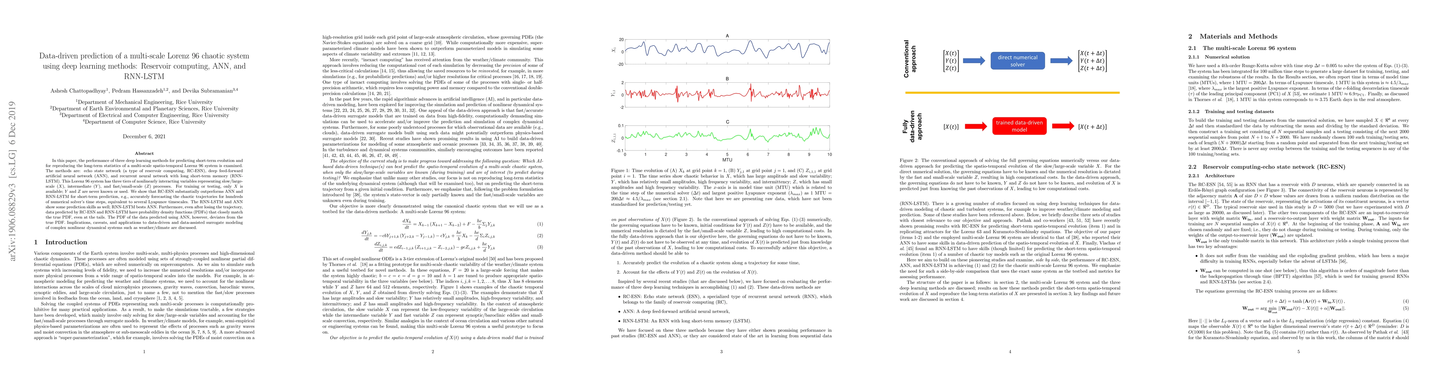 This paper evaluates the efficacy of reservoir computing, ANN, and RNN-LSTM for predicting a multi-scale Lorenz 96 system. The echo state network (RC-ESN) significantly outperforms ANN and RNN-LSTM in short-term predictions, while RNN-LSTM surpasses ANN, and all three methods show good long-term statistical reproduction.