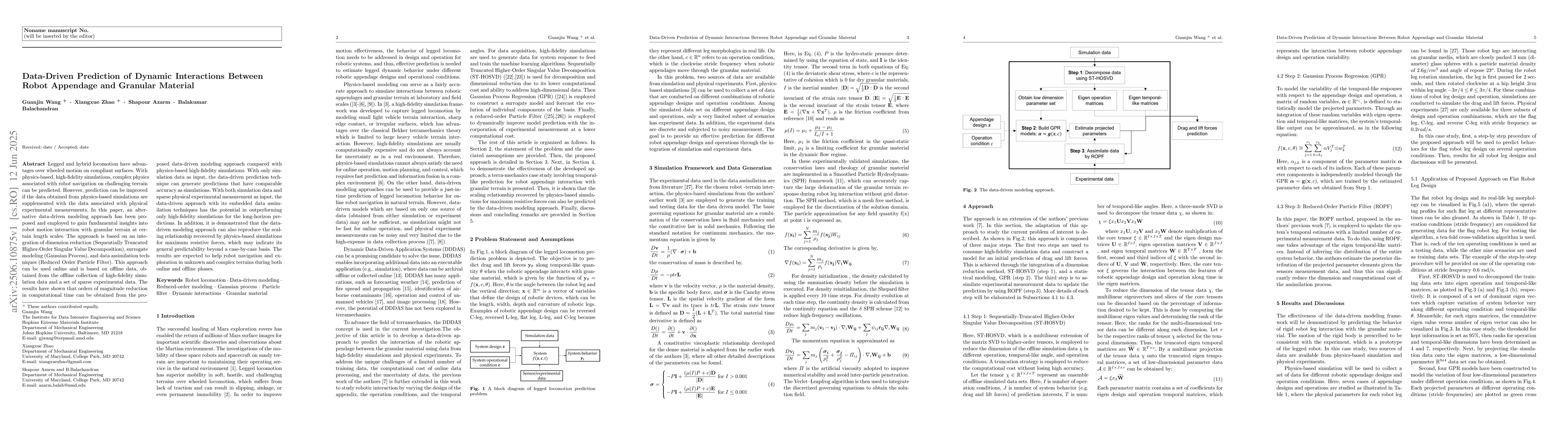 An alternative data-driven modeling approach has been proposed and employed to gain fundamental insights into robot motion interaction with granular terrain at certain length scales. The approach is based on an integration of dimension reduction (Sequentially Truncated Higher-Order Singular Value Decomposition), surrogate modeling (Gaussian Process), and data assimilation techniques (Reduced Order Particle Filter). This approach can be used online and is based on offline data, obtained from the offline collection of high-fidelity simulation data and a set of sparse experimental data. The results have shown that orders of magnitude reduction in computational time can be obtained from the proposed data-driven modeling approach compared with physics-based high-fidelity simulations. With only simulation data as input, the data-driven prediction technique can generate predictions that have comparable accuracy as simulations. With both simulation data and sparse physical experimental measurement as input, the data-driven approach with its embedded data assimilation techniques has the potential in outperforming only high-fidelity simulations for the long-horizon predictions. In addition, it is demonstrated that the data-driven modeling approach can also reproduce the scaling relationship recovered by physics-based simulations for maximum resistive forces, which may indicate its general predictability beyond a case-by-case basis. The results are expected to help robot navigation and exploration in unknown and complex terrains during both online and offline phases.
