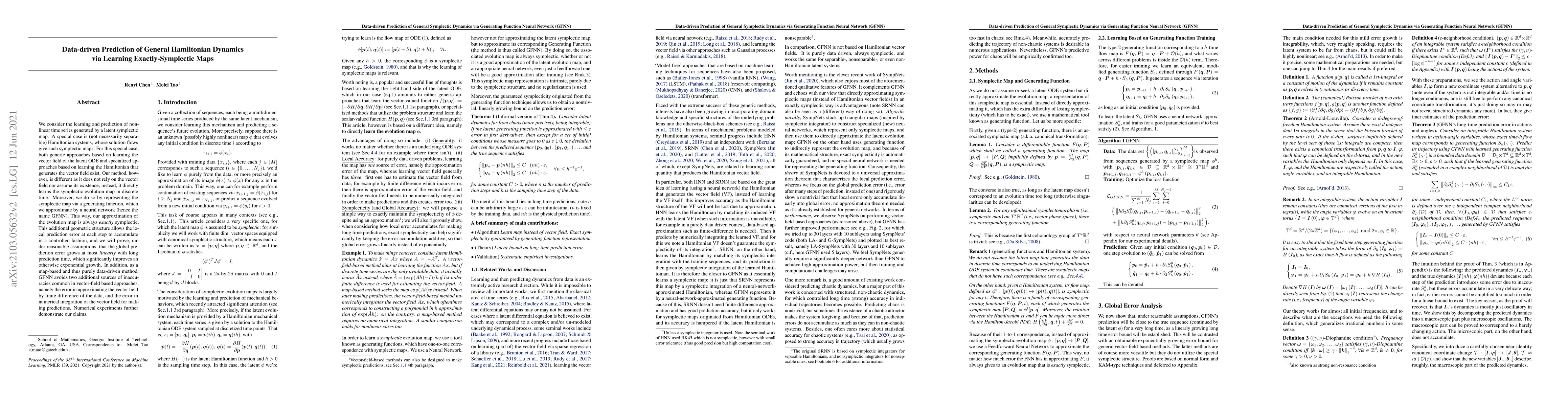 We consider the learning and prediction of nonlinear time series generated by a latent symplectic map. A special case is (not necessarily separable) Hamiltonian systems, whose solution flows give such symplectic maps. For this special case, both generic approaches based on learning the vector field of the latent ODE and specialized approaches based on learning the Hamiltonian that generates the vector field exist. Our method, however, is different as it does not rely on the vector field nor assume its existence; instead, it directly learns the symplectic evolution map in discrete time. Moreover, we do so by representing the symplectic map via a generating function, which we approximate by a neural network (hence the name GFNN). This way, our approximation of the evolution map is always \emph{exactly} symplectic. This additional geometric structure allows the local prediction error at each step to accumulate in a controlled fashion, and we will prove, under reasonable assumptions, that the global prediction error grows at most \emph{linearly} with long prediction time, which significantly improves an otherwise exponential growth. In addition, as a map-based and thus purely data-driven method, GFNN avoids two additional sources of inaccuracies common in vector-field based approaches, namely the error in approximating the vector field by finite difference of the data, and the error in numerical integration of the vector field for making predictions. Numerical experiments further demonstrate our claims.