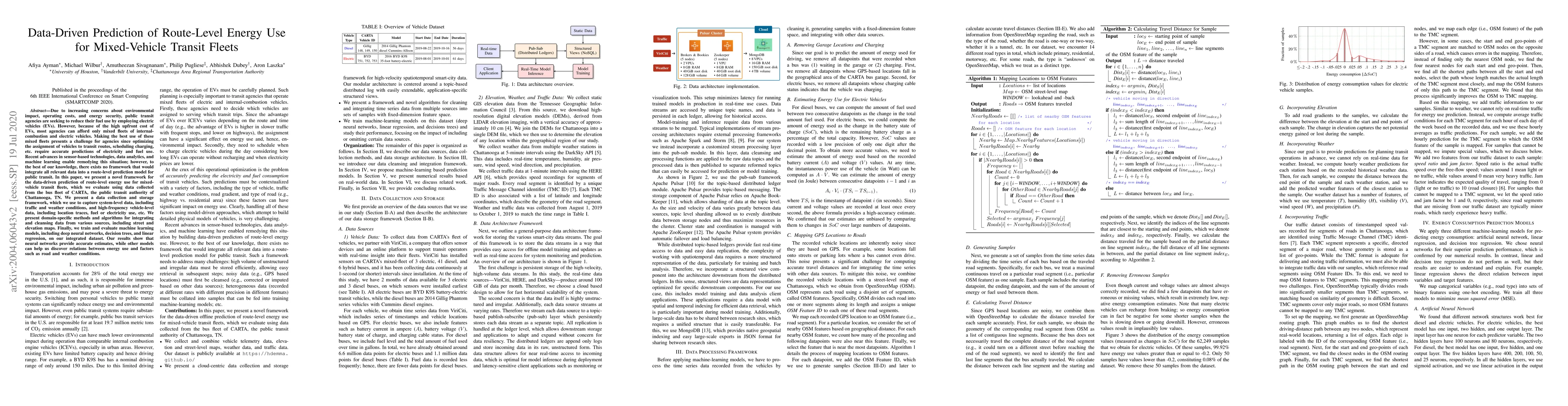 The paper presents a novel framework for data-driven prediction of route-level energy use in mixed-vehicle transit fleets, integrating system-level and vehicle-level data, including traffic and weather conditions, location traces, fuel or electricity use, and street/elevation maps. It uses domain-specific methods and algorithms for data integration and cleansing, followed by training and evaluating machine learning models like deep neural networks, decision trees, and linear regression.