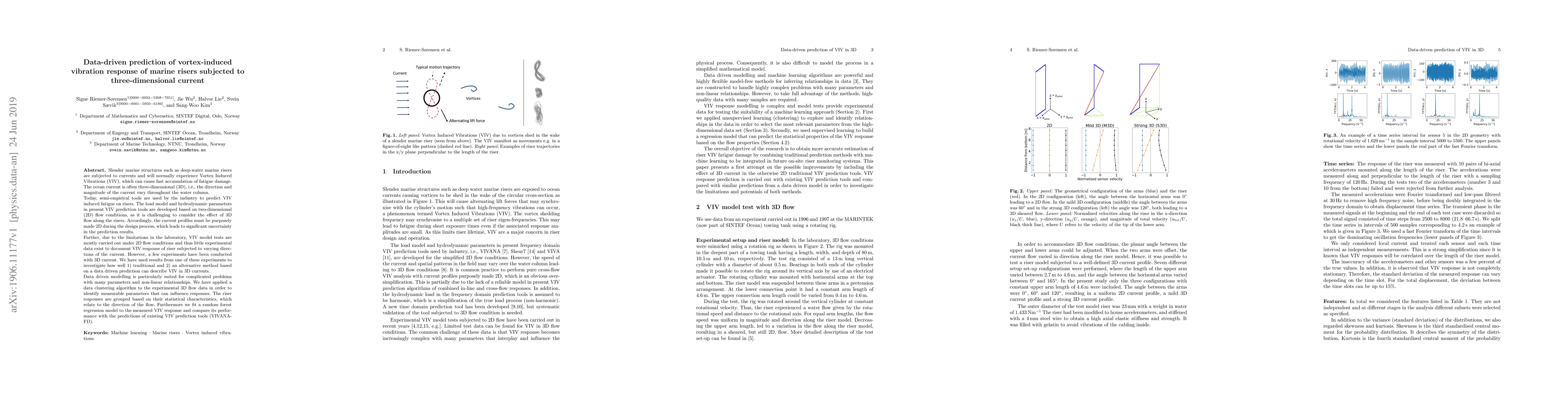 Slender marine structures such as deep-water marine risers are subjected to currents and will normally experience Vortex Induced Vibrations (VIV), which can cause fast accumulation of fatigue damage. The ocean current is often three-dimensional (3D), i.e., the direction and magnitude of the current vary throughout the water column. Today, semi-empirical tools are used by the industry to predict VIV induced fatigue on risers. The load model and hydrodynamic parameters in present VIV prediction tools are developed based on two-dimensional (2D) flow conditions, as it is challenging to consider the effect of 3D flow along the risers. Accordingly, the current profiles must be purposely made 2D during the design process, which leads to significant uncertainty in the prediction results. Further, due to the limitations in the laboratory, VIV model tests are mostly carried out under 2D flow conditions and thus little experimental data exist to document VIV response of riser subjected to varying directions of the current. However, a few experiments have been conducted with 3D current. We have used results from one of these experiments to investigate how well 1) traditional and 2) an alternative method based on a data driven prediction can describe VIV in 3D currents. Data driven modelling is particularly suited for complicated problems with many parameters and non-linear relationships. We have applied a data clustering algorithm to the experimental 3D flow data in order to identify measurable parameters that can influence responses. The riser responses are grouped based on their statistical characteristics, which relate to the direction of the flow. Furthermore we fit a random forest regression model to the measured VIV response and compare its performance with the predictions of existing VIV prediction tools (VIVANA-FD).