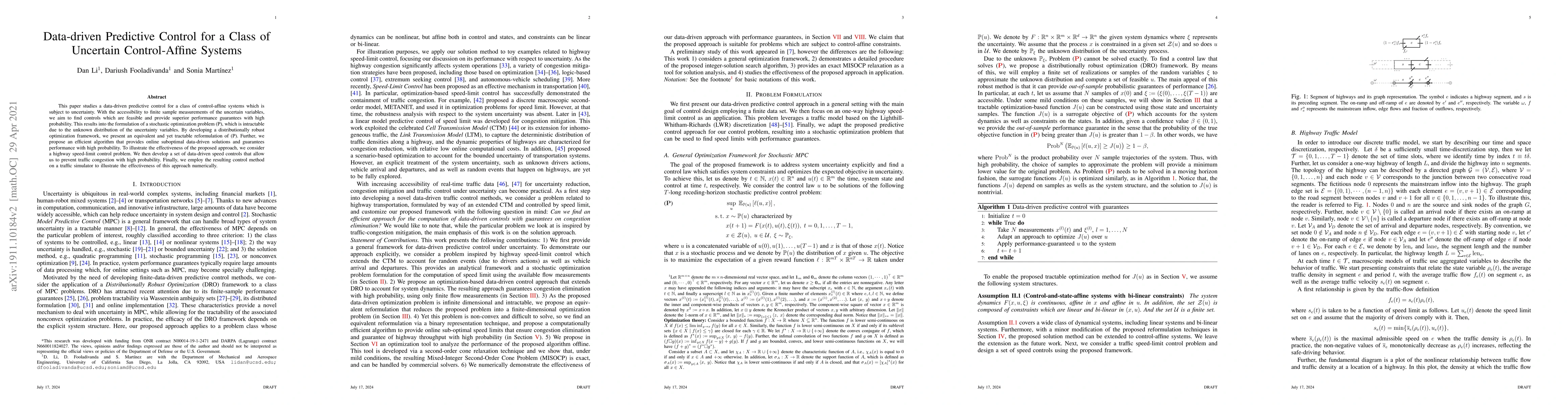 This paper studies a data-driven predictive control for a class of control-affine systems which is subject to uncertainty. With the accessibility to finite sample measurements of the uncertain variables, we aim to find controls which are feasible and provide superior performance guarantees with high probability. This results into the formulation of a stochastic optimization problem (P), which is intractable due to the unknown distribution of the uncertainty variables. By developing a distributionally robust optimization framework, we present an equivalent and yet tractable reformulation of (P). Further, we propose an efficient algorithm that provides online suboptimal data-driven solutions and guarantees performance with high probability. To illustrate the effectiveness of the proposed approach, we consider a highway speed-limit control problem. We then develop a set of data-driven speed controls that allow us to prevent traffic congestion with high probability. Finally, we employ the resulting control method on a traffic simulator to illustrate the effectiveness of this approach numerically.