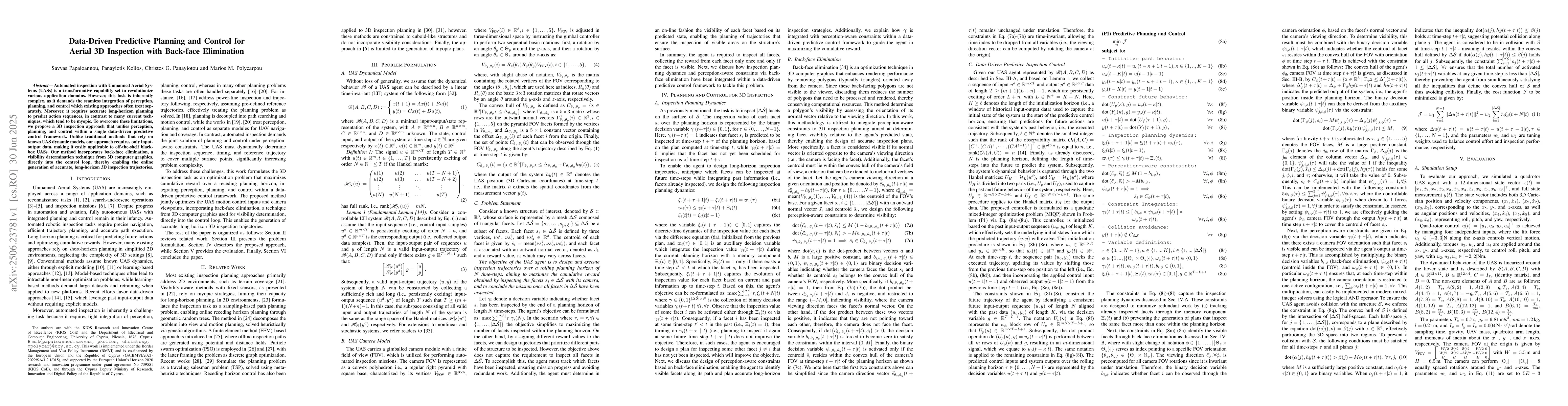 Automated inspection with Unmanned Aerial Systems (UASs) is a transformative capability set to revolutionize various application domains. However, this task is inherently complex, as it demands the seamless integration of perception, planning, and control which existing approaches often treat separately. Moreover, it requires accurate long-horizon planning to predict action sequences, in contrast to many current techniques, which tend to be myopic. To overcome these limitations, we propose a 3D inspection approach that unifies perception, planning, and control within a single data-driven predictive control framework. Unlike traditional methods that rely on known UAS dynamic models, our approach requires only input-output data, making it easily applicable to off-the-shelf black-box UASs. Our method incorporates back-face elimination, a visibility determination technique from 3D computer graphics, directly into the control loop, thereby enabling the online generation of accurate, long-horizon 3D inspection trajectories.