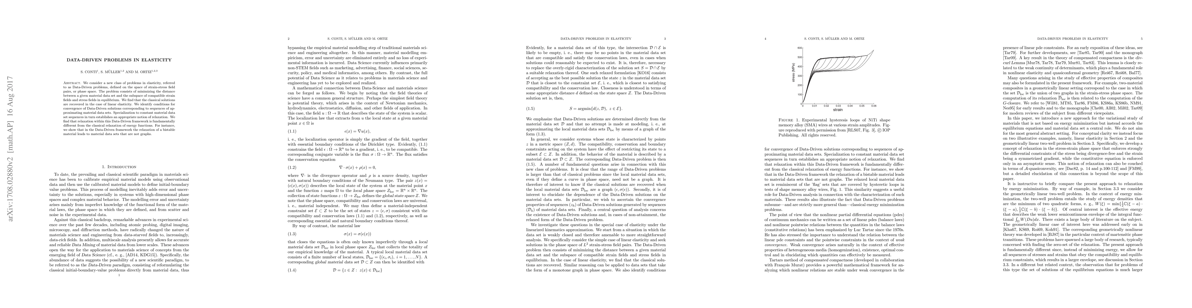 This paper introduces a new class of Data-Driven problems in elasticity, focusing on minimizing the distance between material data and compatible strain-stress fields. It reveals that classical solutions emerge in linear elasticity and identifies conditions for convergence of Data-Driven solutions, showing that relaxation in this framework differs fundamentally from classical relaxation methods.