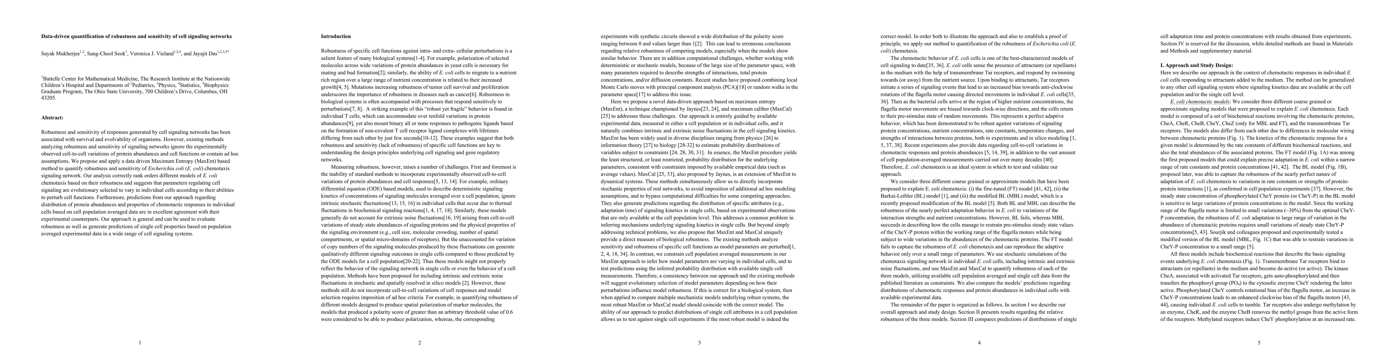This paper proposes a data-driven Maximum Entropy method to quantify the robustness and sensitivity of Escherichia coli chemotaxis signaling networks, addressing the limitations of existing methods. The approach accurately ranks different models based on robustness and predicts protein abundances and chemotactic responses, aligning well with experimental data.
