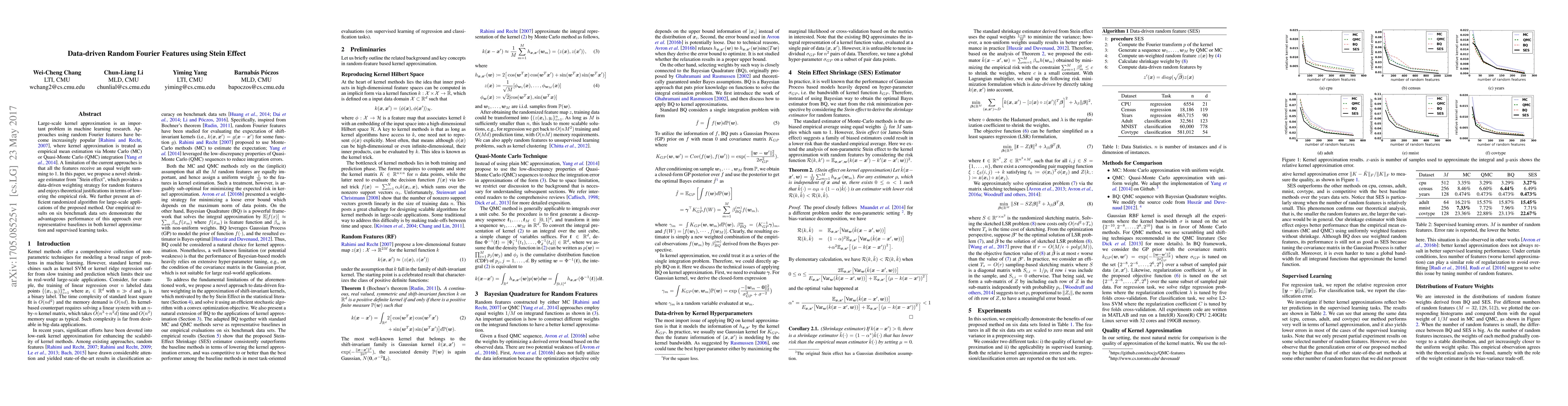 This paper proposes a novel data-driven weighting strategy for random Fourier features based on the "Stein effect" to improve kernel approximation. The method lowers empirical risk and outperforms baselines in both kernel approximation and supervised learning tasks on benchmark datasets.