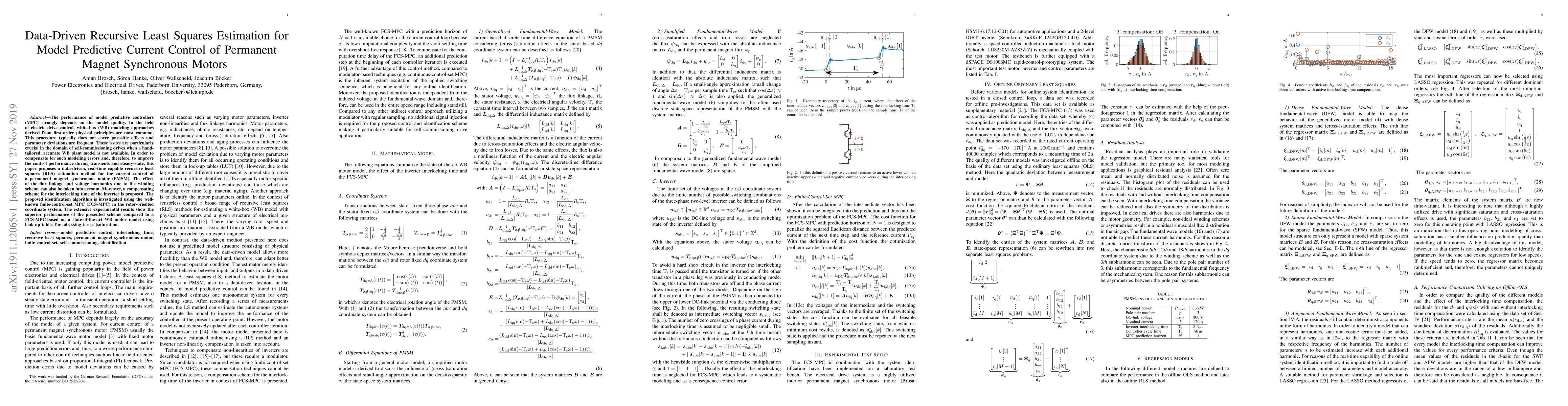 The performance of model predictive controllers (MPC) strongly depends on the model quality. In the field of electric drive control, white-box (WB) modeling approaches derived from first-order physical principles are most common. This procedure typically does not cover parasitic effects and parameter deviations are frequent. These issues are particularly crucial in the domain of self-commissioning drives when a hand-tailored, accurate WB plant model is not available. In order to compensate for such modeling errors and, therefore, to improve the control performance during transients and steady-state, this paper proposes a data-driven, real-time capable recursive least squares (RLS) estimation method for the current control of a permanent magnet synchronous motor (PMSM). The effect of the flux linkage and voltage harmonics due to the winding scheme can also be taken into account. Moreover, a compensating scheme for the interlocking time of the inverter is proposed. The proposed identification algorithm is investigated using the well-known finite-control-set MPC (FCS-MPC) in the rotor-oriented coordinate system. The extensive experimental results show the superior performance of the presented scheme compared to a FCS-MPC-based on a state-of-the-art WB motor model using look-up tables for adressing (cross-)saturation.