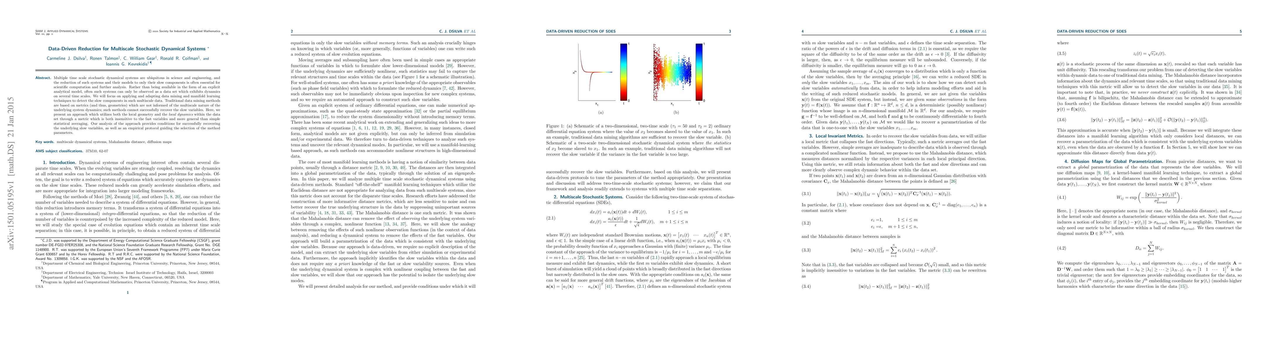 The paper presents a methodology for computing a parametrization of a dataset that respects the slow variables in the underlying dynamical system, utilizing diffusion maps with the Mahalanobis distance as the metric. It demonstrates how the Mahalanobis distance collapses the fast direction within a dataset, enabling successful recovery of slow variables, and shows how to estimate covariances directly from data.