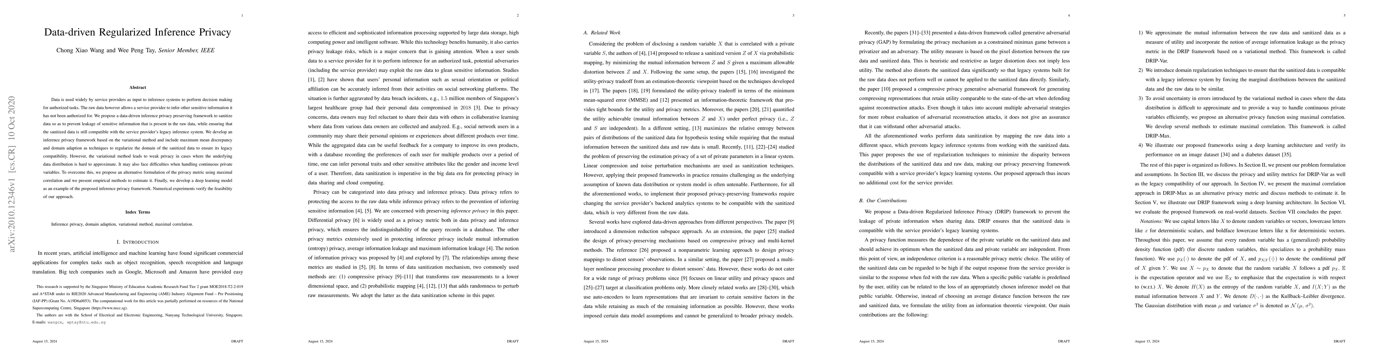 Data is used widely by service providers as input to inference systems to perform decision making for authorized tasks. The raw data however allows a service provider to infer other sensitive information it has not been authorized for. We propose a data-driven inference privacy preserving framework to sanitize data so as to prevent leakage of sensitive information that is present in the raw data, while ensuring that the sanitized data is still compatible with the service provider's legacy inference system. We develop an inference privacy framework based on the variational method and include maximum mean discrepancy and domain adaption as techniques to regularize the domain of the sanitized data to ensure its legacy compatibility. However, the variational method leads to weak privacy in cases where the underlying data distribution is hard to approximate. It may also face difficulties when handling continuous private variables. To overcome this, we propose an alternative formulation of the privacy metric using maximal correlation and we present empirical methods to estimate it. Finally, we develop a deep learning model as an example of the proposed inference privacy framework. Numerical experiments verify the feasibility of our approach.