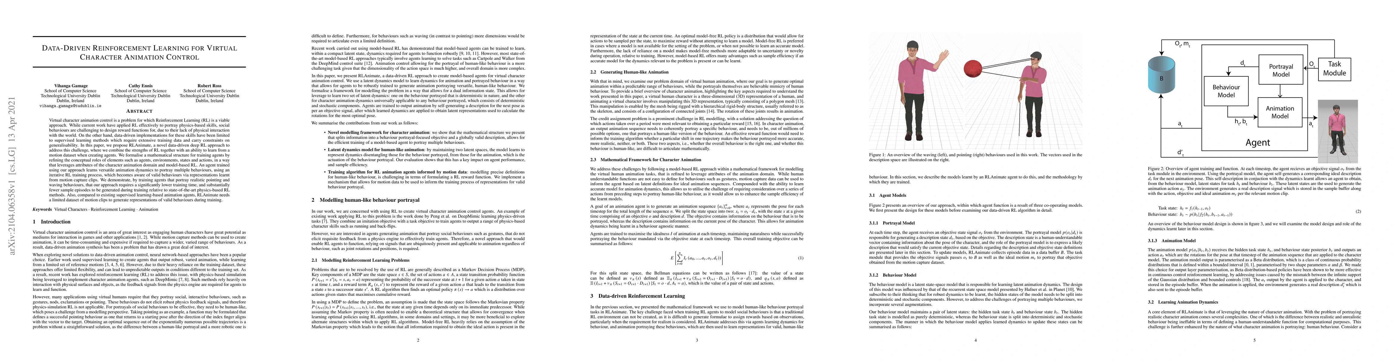 The paper proposes RLAnimate, a data-driven deep reinforcement learning approach for virtual character animation control, combining RL with motion dataset learning to address challenges in designing reward functions for social behaviors.