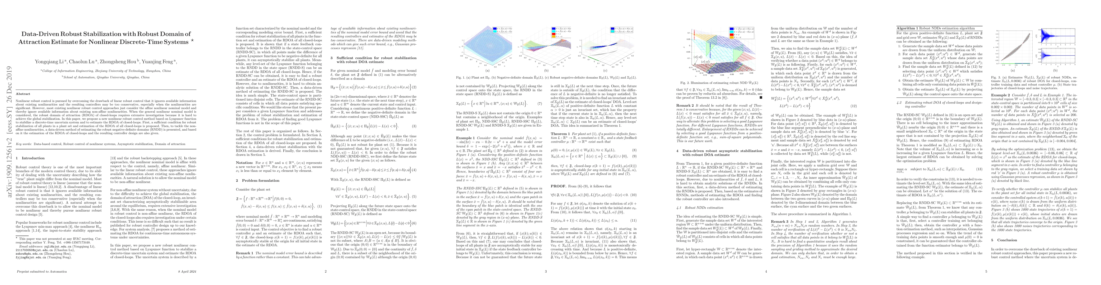 This paper proposes a new data-driven robust control method for nonlinear discrete-time systems, utilizing Lyapunov functions to stabilize uncertain plants and estimate the robust domain of attraction (RDOA). It addresses non-affine nonlinearities through a data-driven approach to estimate robust negative-definite domains, facilitating effective controller design.