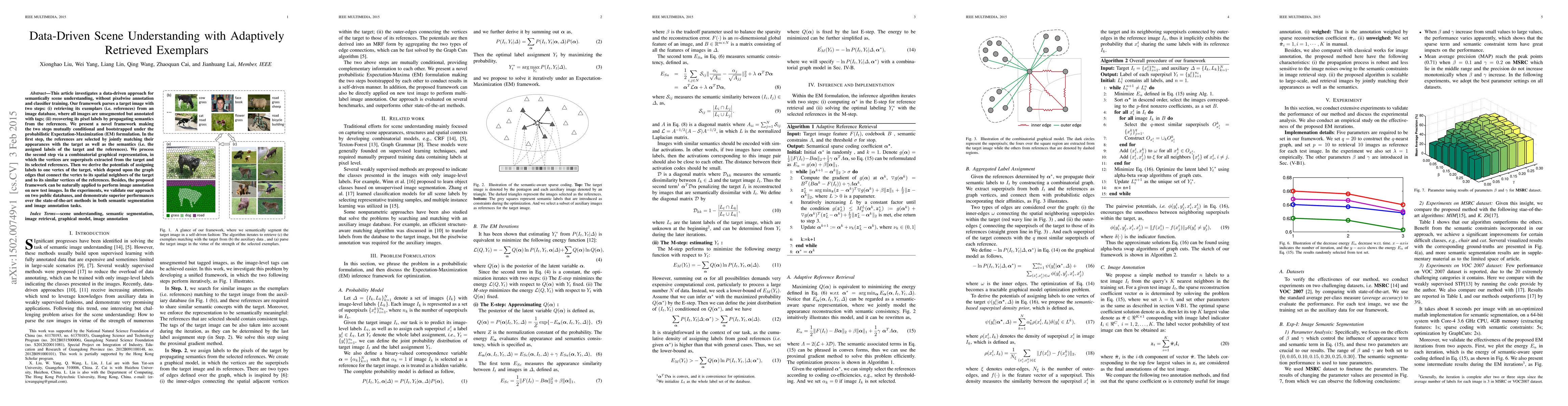 This article investigates a data-driven approach for semantically scene understanding, without pixelwise annotation and classifier training. Our framework parses a target image with two steps: (i) retrieving its exemplars (i.e. references) from an image database, where all images are unsegmented but annotated with tags; (ii) recovering its pixel labels by propagating semantics from the references. We present a novel framework making the two steps mutually conditional and bootstrapped under the probabilistic Expectation-Maximization (EM) formulation. In the first step, the references are selected by jointly matching their appearances with the target as well as the semantics (i.e. the assigned labels of the target and the references). We process the second step via a combinatorial graphical representation, in which the vertices are superpixels extracted from the target and its selected references. Then we derive the potentials of assigning labels to one vertex of the target, which depend upon the graph edges that connect the vertex to its spatial neighbors of the target and to its similar vertices of the references. Besides, the proposed framework can be naturally applied to perform image annotation on new test images. In the experiments, we validate our approach on two public databases, and demonstrate superior performances over the state-of-the-art methods in both semantic segmentation and image annotation tasks.