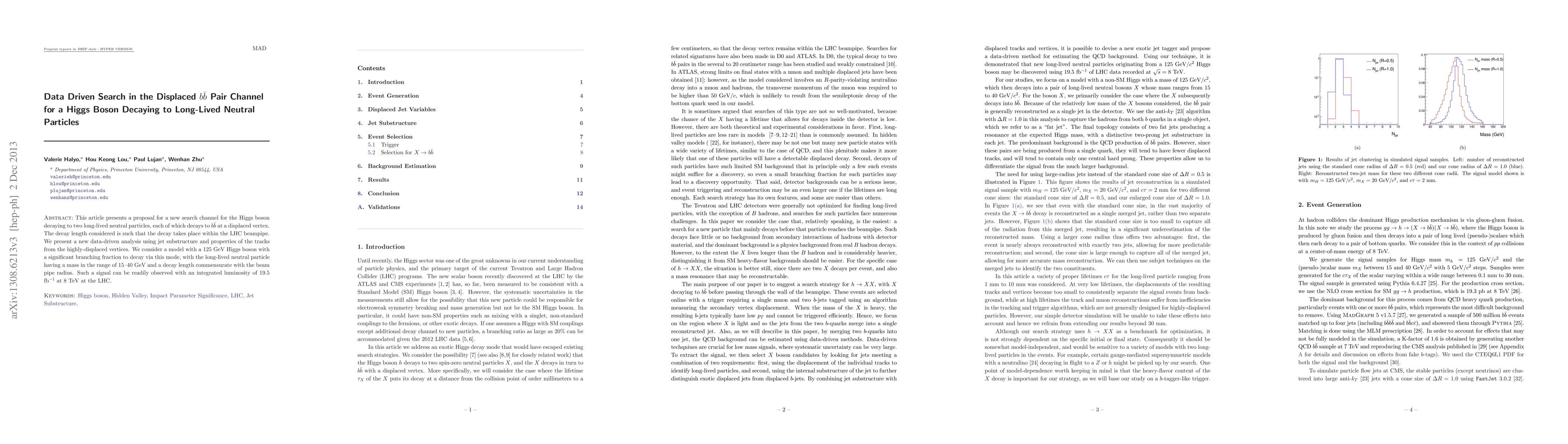 This article presents a proposal for a new search channel for the Higgs boson decaying to two long-lived neutral particles, each of which decays to $b\bar b$ at a displaced vertex. The decay length considered is such that the decay takes place within the LHC beampipe. We present a new data-driven analysis using jet substructure and properties of the tracks from the highly-displaced vertices. We consider a model with a 125 GeV Higgs boson with a significant branching fraction to decay via this mode, with the long-lived neutral particle having a mass in the range of 15--40 GeV and a decay length commensurate with the beam pipe radius. Such a signal can be readily observed with an integrated luminosity of 19.5 fb$^{-1}$ at 8TeV at the LHC.