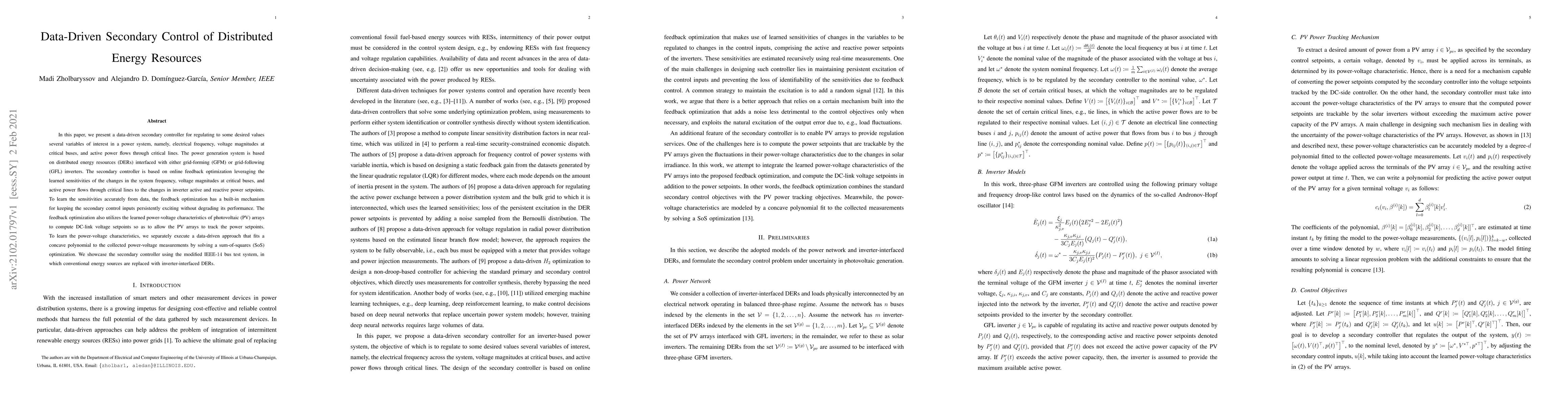 In this paper, we present a data-driven secondary controller for regulating to some desired values several variables of interest in a power system, namely, electrical frequency, voltage magnitudes at critical buses, and active power flows through critical lines. The power generation system is based on distributed energy resources (DERs) interfaced with either grid-forming (GFM) or grid-following (GFL) inverters. The secondary controller is based on online feedback optimization leveraging the learned sensitivities of the changes in the system frequency, voltage magnitudes at critical buses, and active power flows through critical lines to the changes in inverter active and reactive power setpoints. To learn the sensitivities accurately from data, the feedback optimization has a built-in mechanism for keeping the secondary control inputs persistently exciting without degrading its performance. The feedback optimization also utilizes the learned power-voltage characteristics of photovoltaic (PV) arrays to compute DC-link voltage setpoints so as to allow the PV arrays to track the power setpoints. To learn the power-voltage characteristics, we separately execute a data-driven approach that fits a concave polynomial to the collected power-voltage measurements by solving a sum-of-squares (SoS) optimization. We showcase the secondary controller using the modified IEEE-14 bus test system, in which conventional energy sources are replaced with inverter-interfaced DERs.