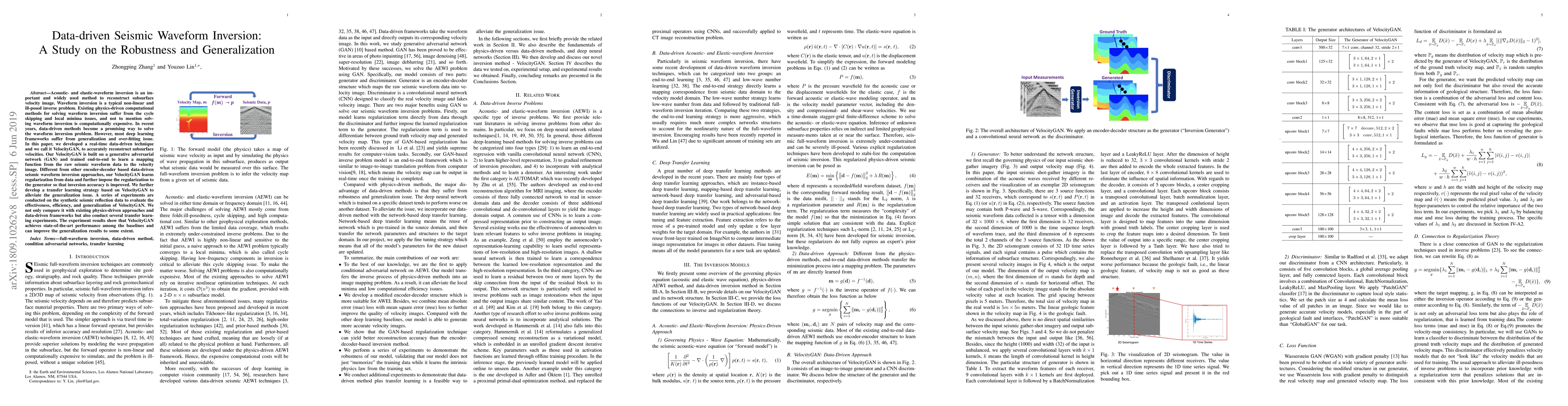 This paper introduces VelocityGAN, a data-driven technique based on GANs for seismic waveform inversion, which improves inversion accuracy and addresses generalization issues. Experiments on synthetic data show VelocityGAN outperforms existing methods and enhances generalization through transfer learning.