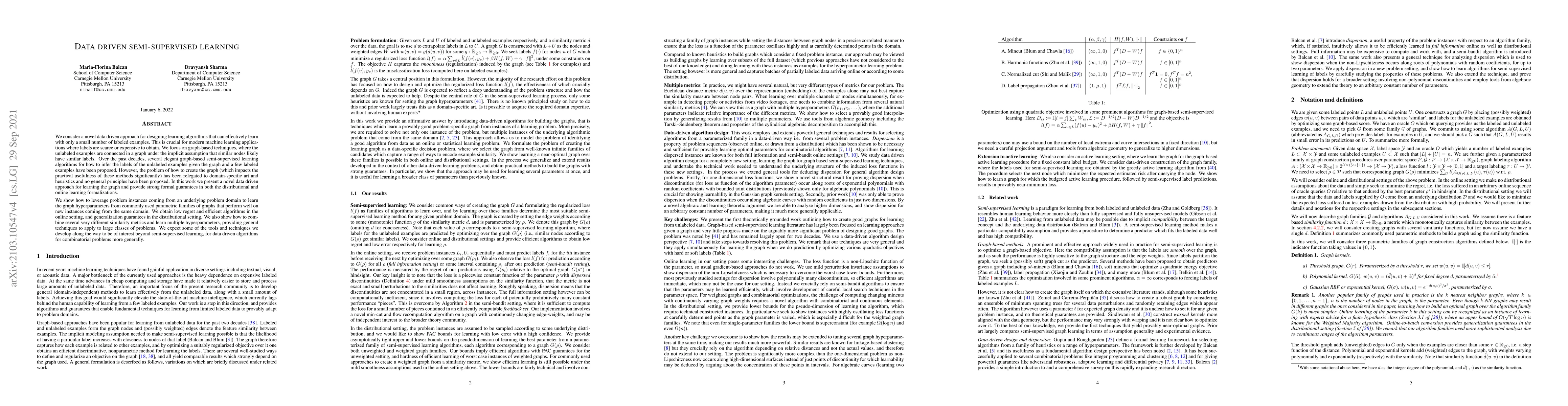 This paper introduces a data-driven method for designing semi-supervised learning algorithms that require few labeled examples, leveraging graph-based techniques to infer labels from unlabeled data. It proposes a novel approach to learn graph hyperparameters from problem instances, achieving low regret and generalization guarantees, and aims to extend its techniques to broader combinatorial problems.