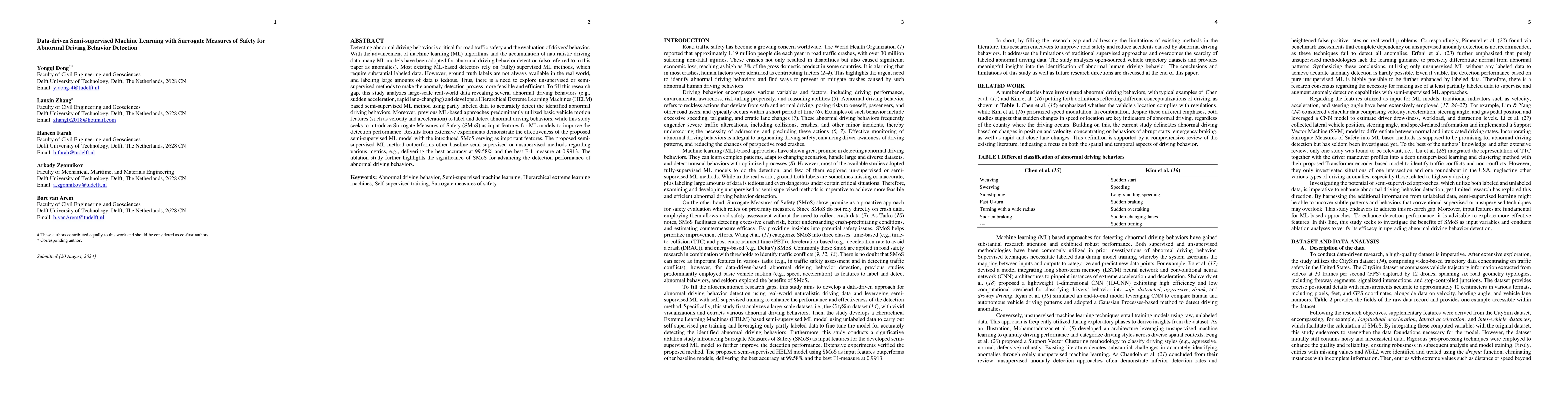 This paper proposes a semi-supervised machine learning method using Hierarchical Extreme Learning Machines (HELM) and Surrogate Safety Measures (SSMs) for detecting abnormal driving behaviors, achieving high accuracy and F-1 score, outperforming other methods, and highlighting the importance of SSMs in improving detection performance.