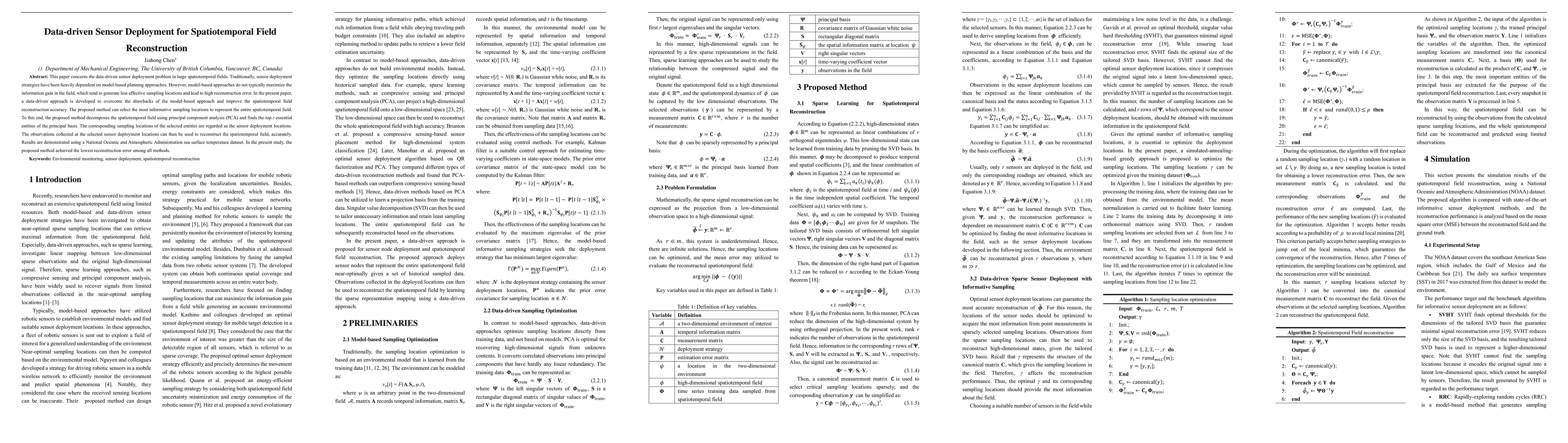 This paper proposes a data-driven sensor deployment method to improve the accuracy of spatiotemporal field reconstruction, overcoming limitations of model-based approaches. The method uses PCA to identify the most informative sampling locations, achieving the lowest reconstruction error demonstrated with a NOAA sea surface temperature dataset.
